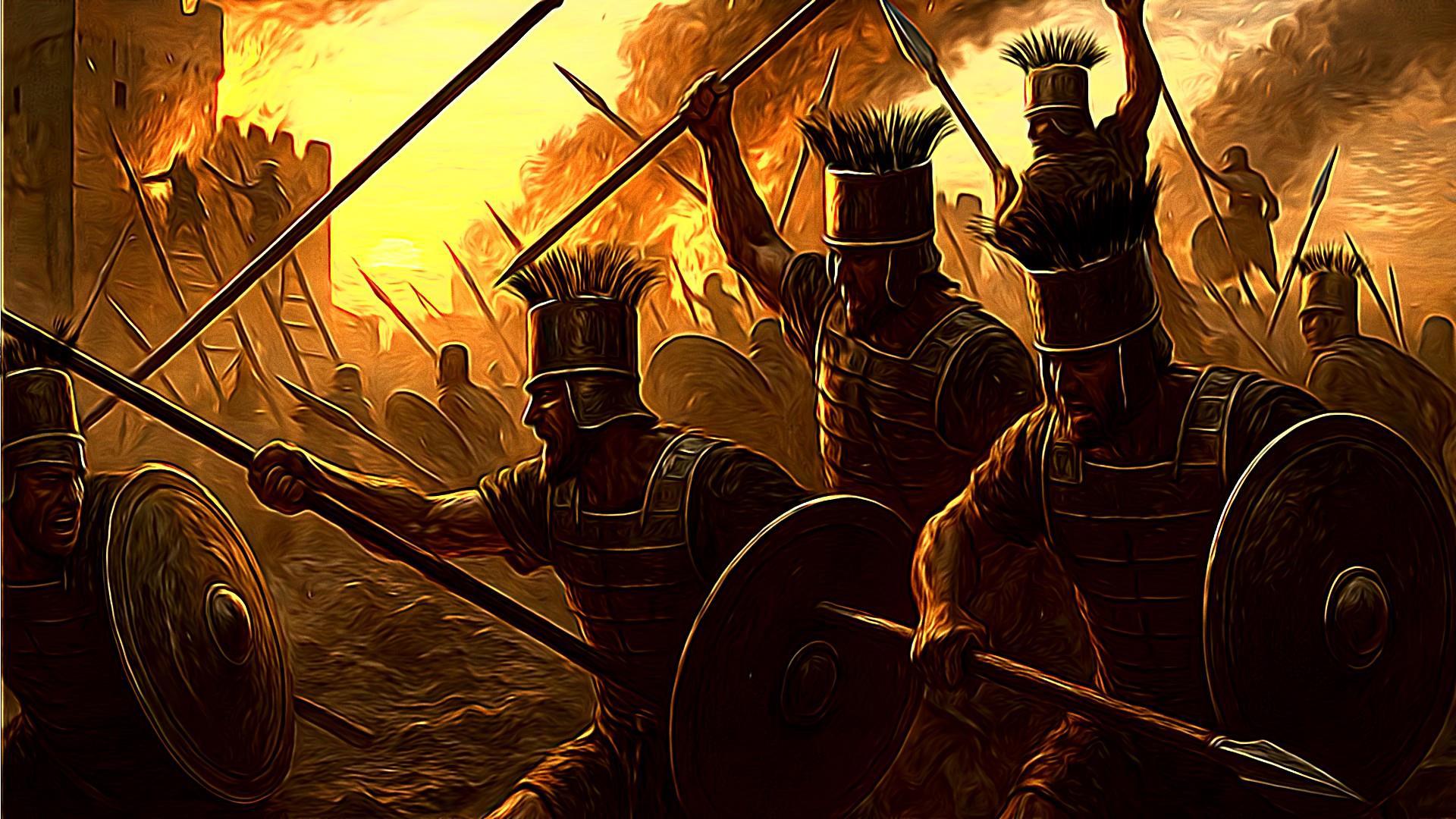 Астианакс докладывает ему, что видел. А видел он много всякого. Как горят города, например. Аттаримму, город ликийских солимов штурмуют наёмники Беллерофонта, люди Этеокла-Тавагалавы и троянца Арата. У Арата под началом в основном не соотечественники, а островитяне, те самые, которых чуть позже египтяне будут звать пелесет. Они же филистимляне. Они же пеласги. Вот они, в характерных шлемах, бронзовых цилиндрах, то ли с перьями, то ли с конским волосом.