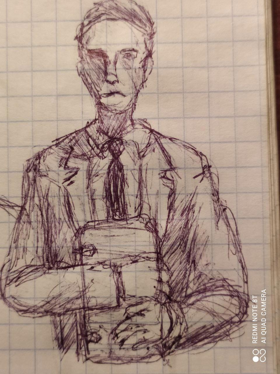 ... но ни один писатель так и не смог сравниться с Говардом-сенсеем. Двустворчатые врата... принадлежат лишь ему одному – и он, Говард, живущий в моей голове, сидит у них, играя на скрипке безумного Эриха Цанна апокалиптические пассажи, прекрасные, коварные и смертоносные, как полыхающие сверхновые, и... ждёт, пока кто-то смахнёт пыль с могилы его праобраза – писателя Говарда Филипса Лавкрафта.
