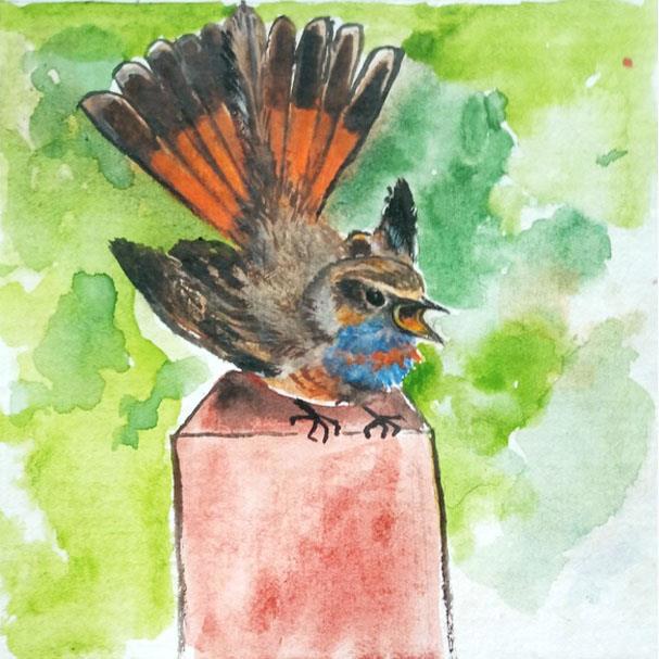 Тут у нас на даче нарисовались чудные гости. Варакушки. Почему -то их пару лет не было видно, а тут, собираю малину и та-дам! Сел красивый птиц на забор и давай радовать журчавой песней. Не зря их называют цветными соловьями, очень здорово поют)).