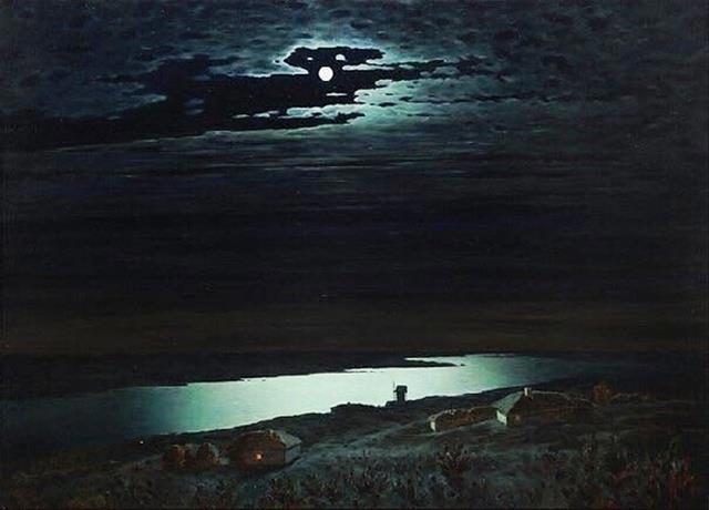 Картинка ниже для атмосферы: "Ночь над Днепром" великого Куинджи. Меня эта картина завораживает. Тут и рассматривать-то, собственно, нечего, но хочется рассматривать и рассматривать. Хотя, почему только для атмосферы? Пусть это будет селение Хаврен на берегу Апенраде из романа Р.Дж.Гольярда "Семь королей".