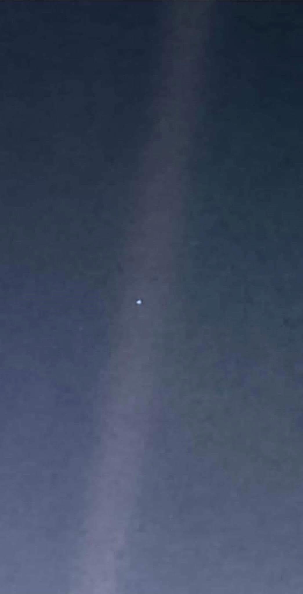 "Взгляните ещё раз на эту точку. Это здесь. Это наш дом. Это мы. Все, кого вы любите, все, кого вы знаете, все, о ком вы когда-либо слышали, все когда-либо существовавшие люди прожили свои жизни на ней. Множество наших наслаждений и страданий, тысячи самоуверенных религий, идеологий и экономических доктрин, каждый охотник и собиратель, каждый герой и трус, каждый созидатель и разрушитель цивилизаций, каждый король и крестьянин, каждая влюблённая пара, каждая мать и каждый отец, каждый способный ребёнок, изобретатель и путешественник, каждый преподаватель этики, каждый лживый политик, каждая «суперзвезда», каждый «величайший лидер», каждый святой и грешник в истории нашего вида жили здесь - на соринке, подвешенной в солнечном луче.