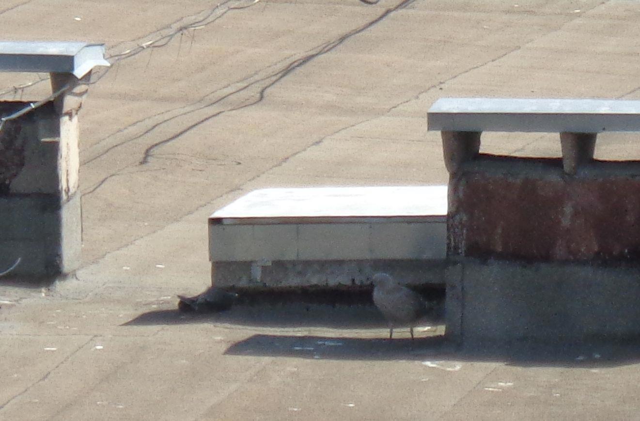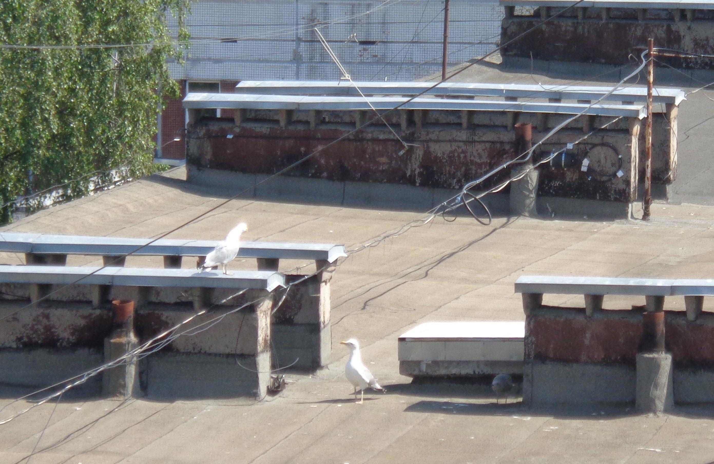 Мы с сестрой наконец поняли, почему у нас постоянно "пасётся" чайка. Оказывается, у неё на крыше соседней пятиэтажки - птенцы! Сейчас они слегка подросли и начали вылезать на видное место. Пока ещё не летают, но думаю, скоро начнут учиться это делать.