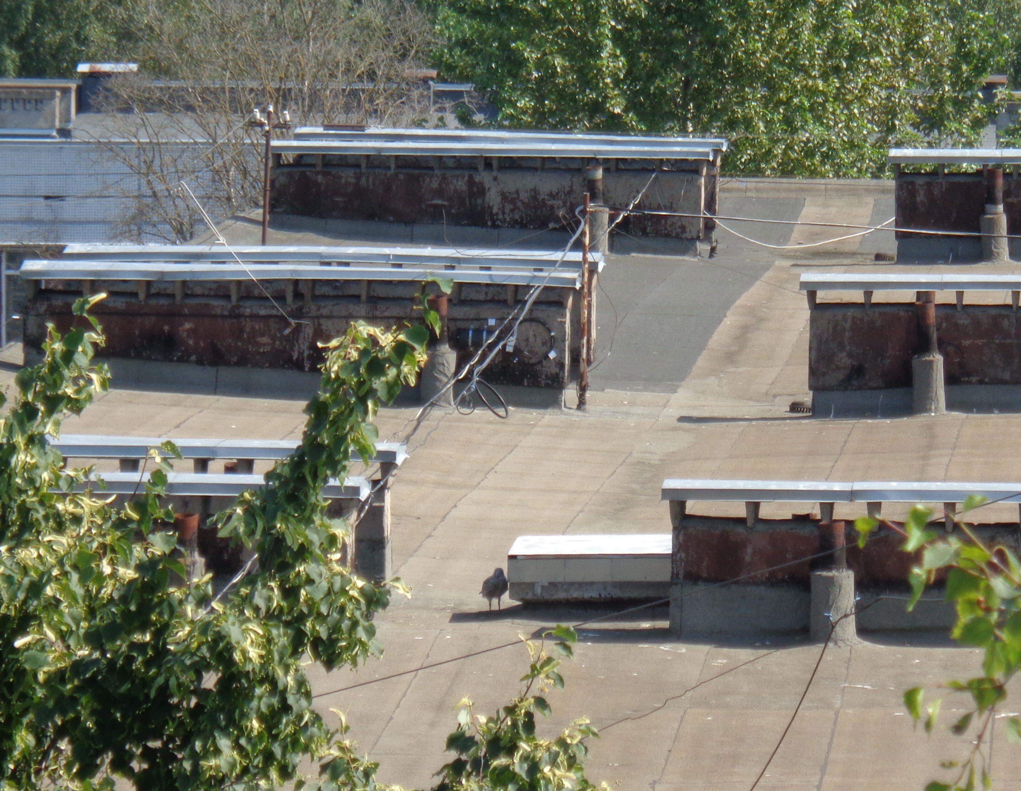 Сфотографировать трудно: далеко, да и окрас у птенцов защитный, сливается с серой крышей. Получилось более-менее зафиксировать одного. Но там их два. Сегодня мы угостили их мамашу куриным хвостом и она отнесла часть птенцам. Те за ней некоторое время бегали по крыше, надеясь на продолжение.