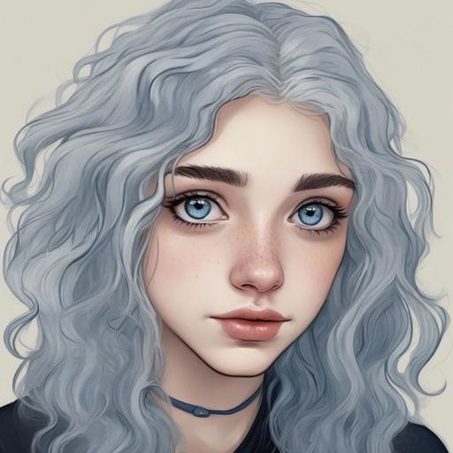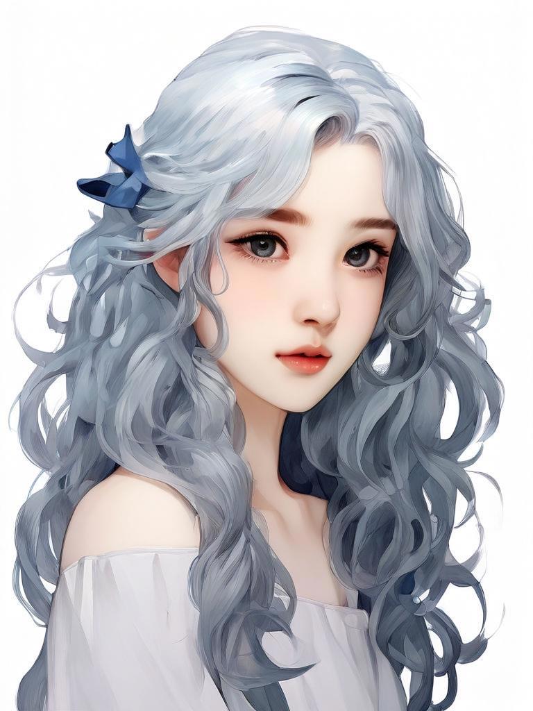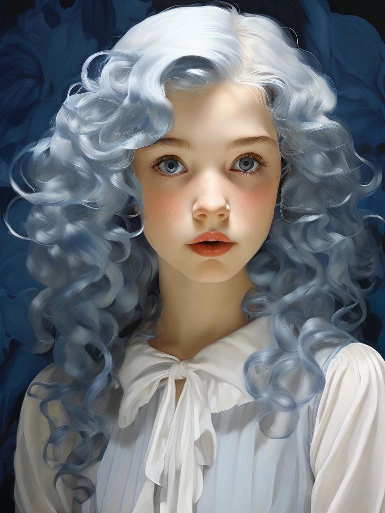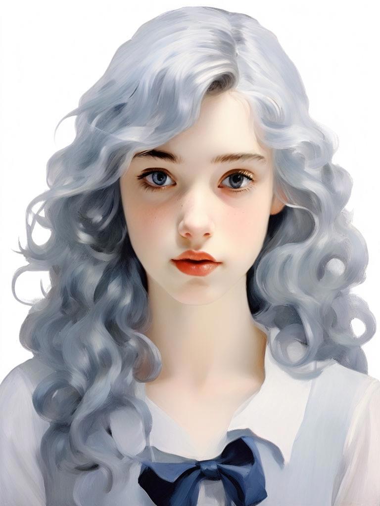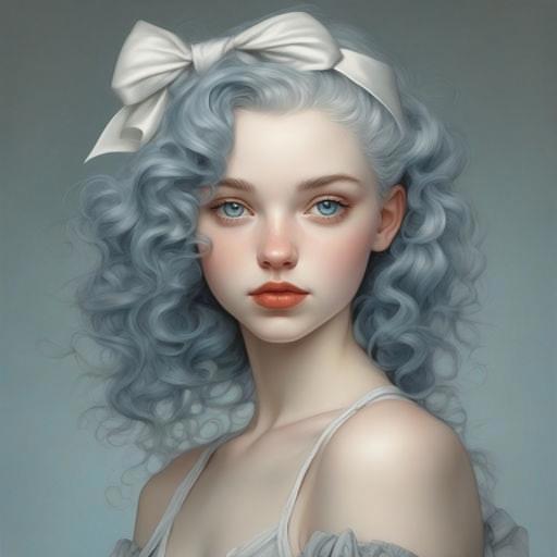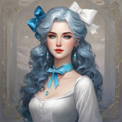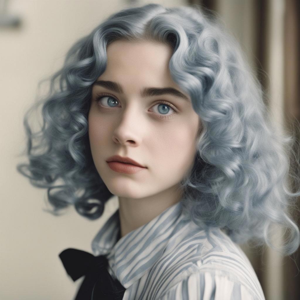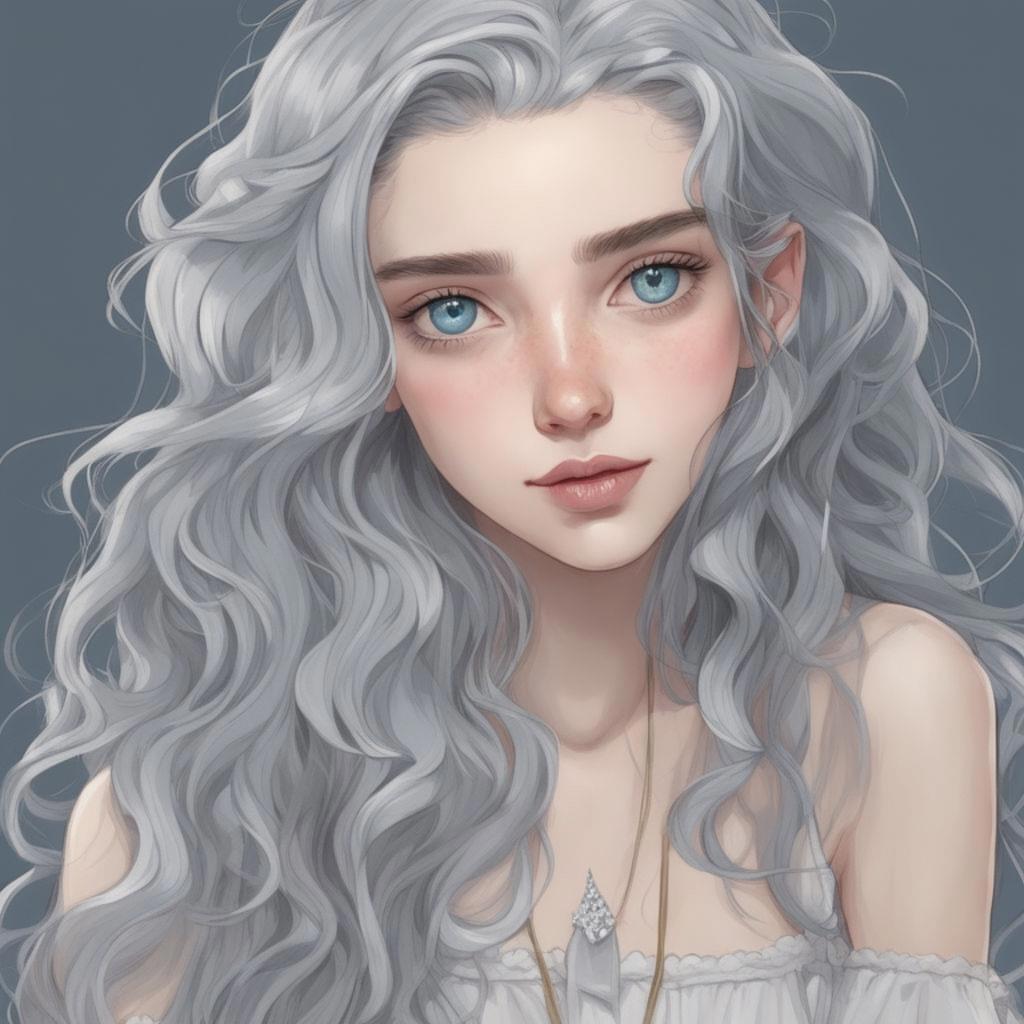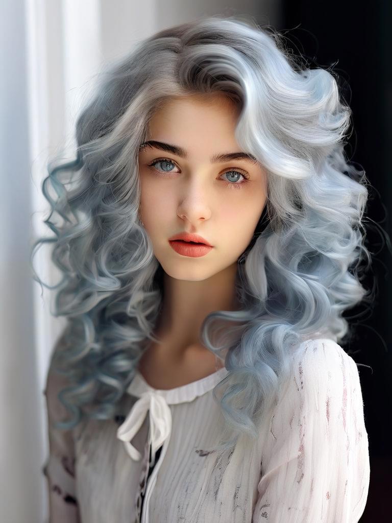 Девятнадцатилетняя девушка с волнистыми волосами серо-синего цвета, серо-синими глазами, белой кожей, прямым носиком и губками бантиком