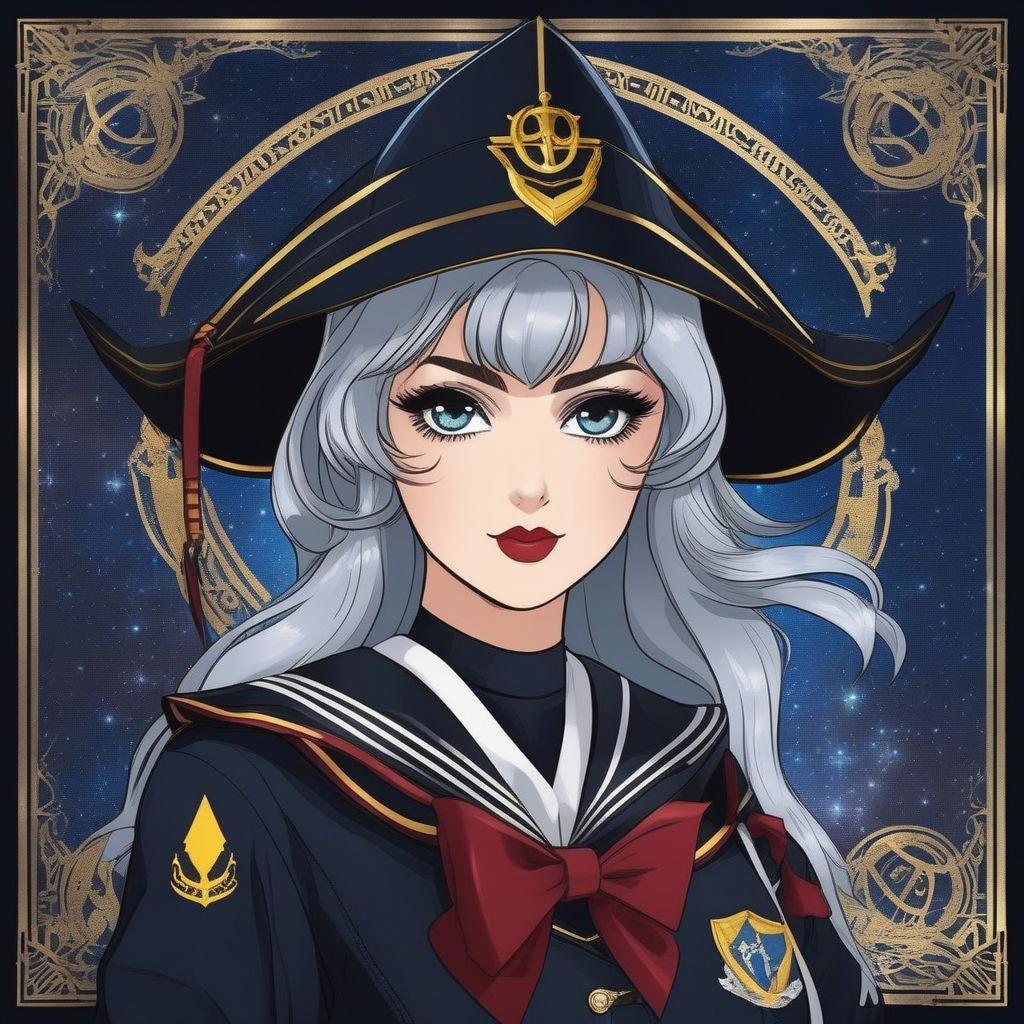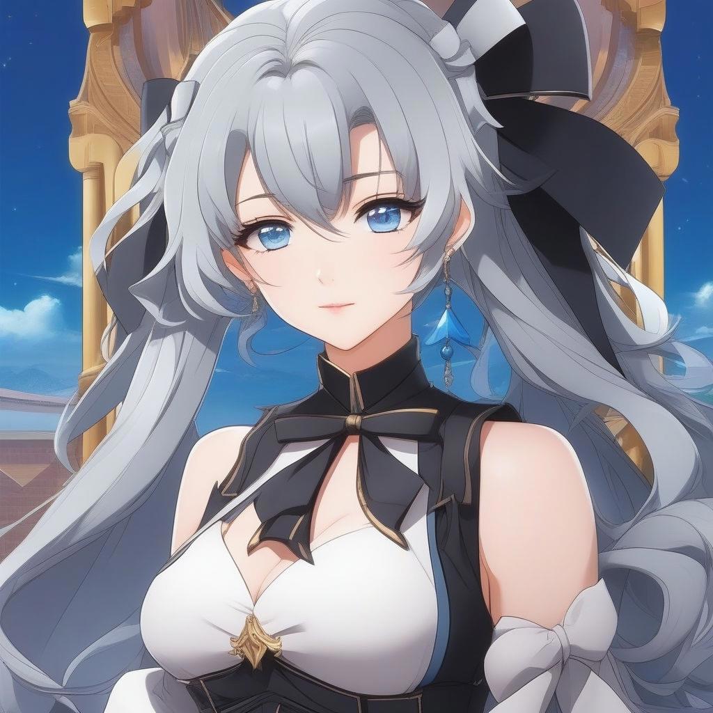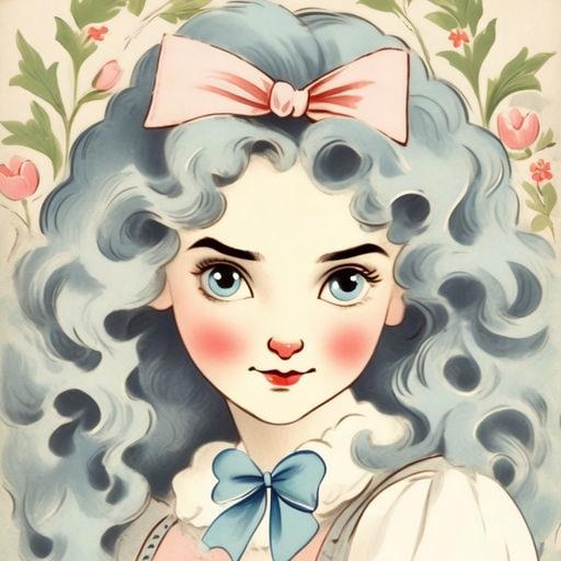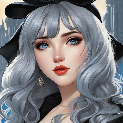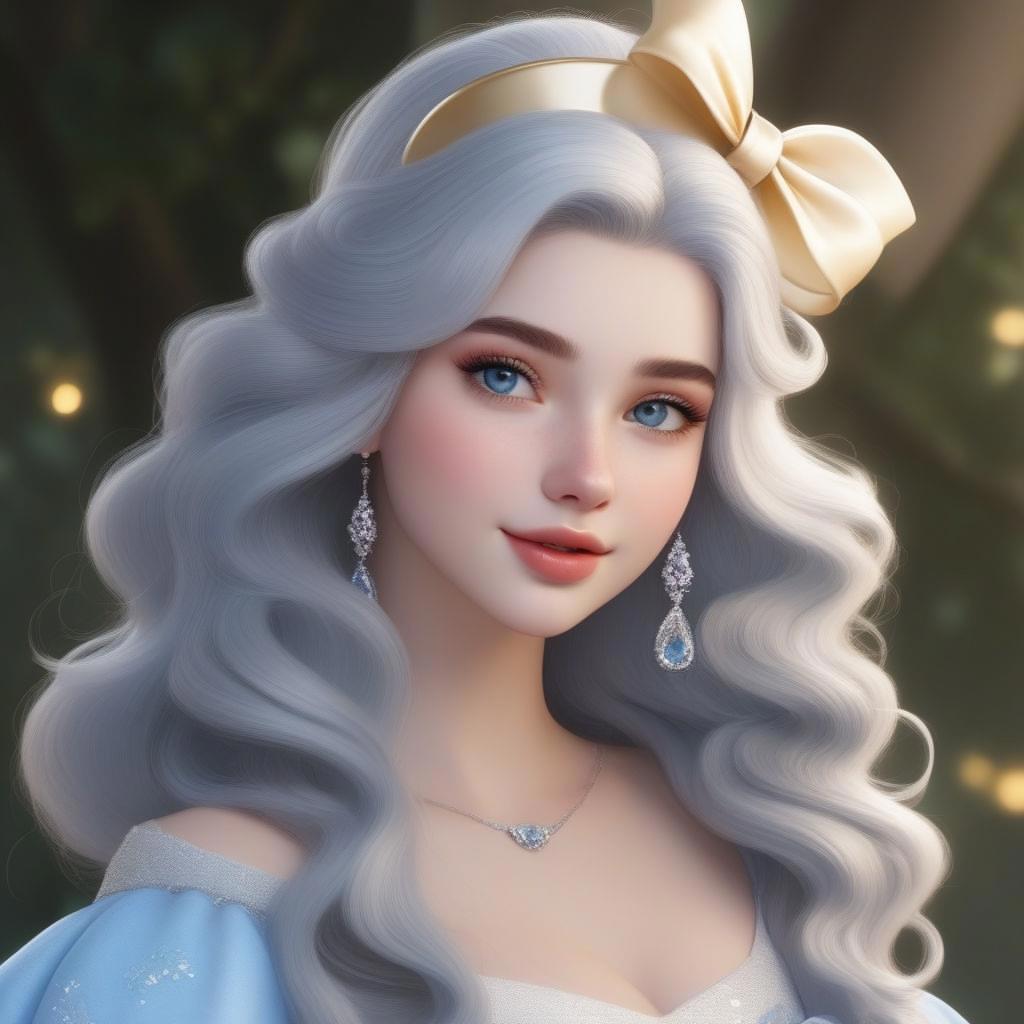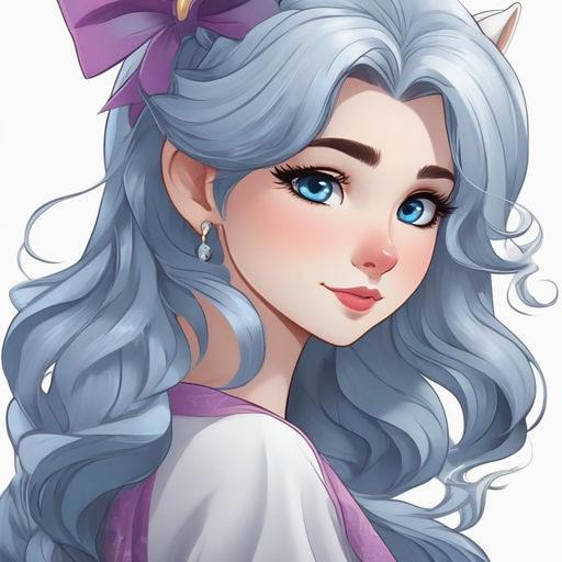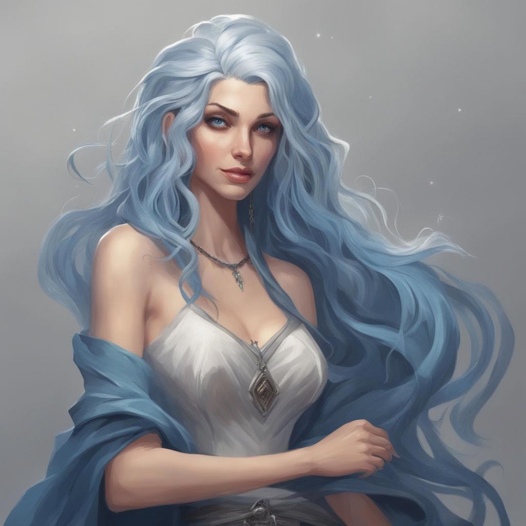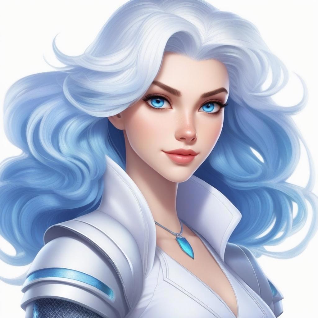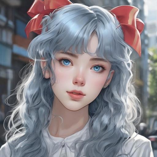 Девятнадцатилетняя девушка с волнистыми волосами серо-синего цвета, серо-синими глазами, белой кожей, прямым носиком и губками бантиком