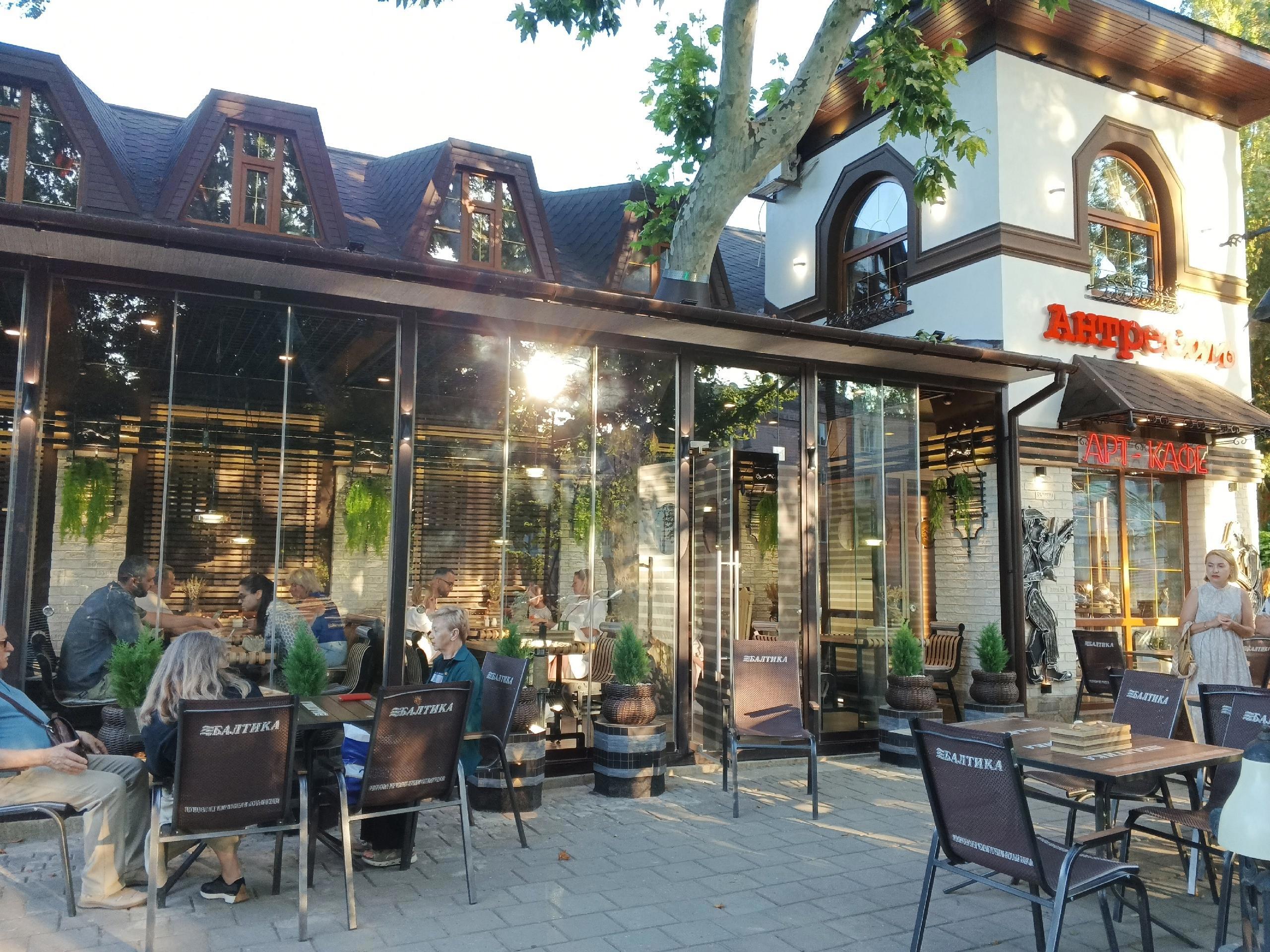 Пару лет назад летняя веранда была открыта, а столиков на улице было всего два или три... Зато сейчас. Веранда приобрела прекрасное остекление, площадка расширилась и здесь теперь достаточно столиков для любителей посидеть под открытым небом.