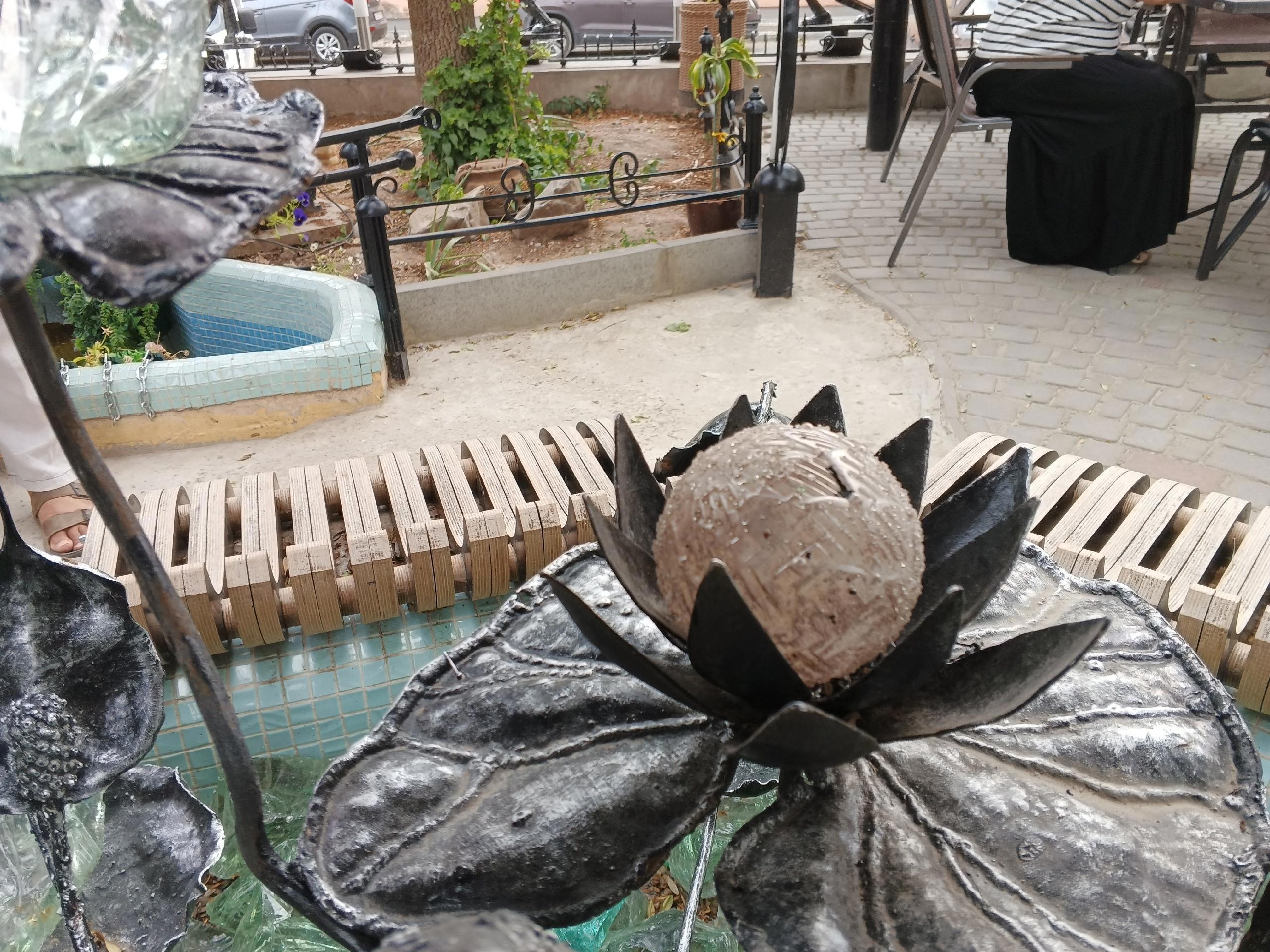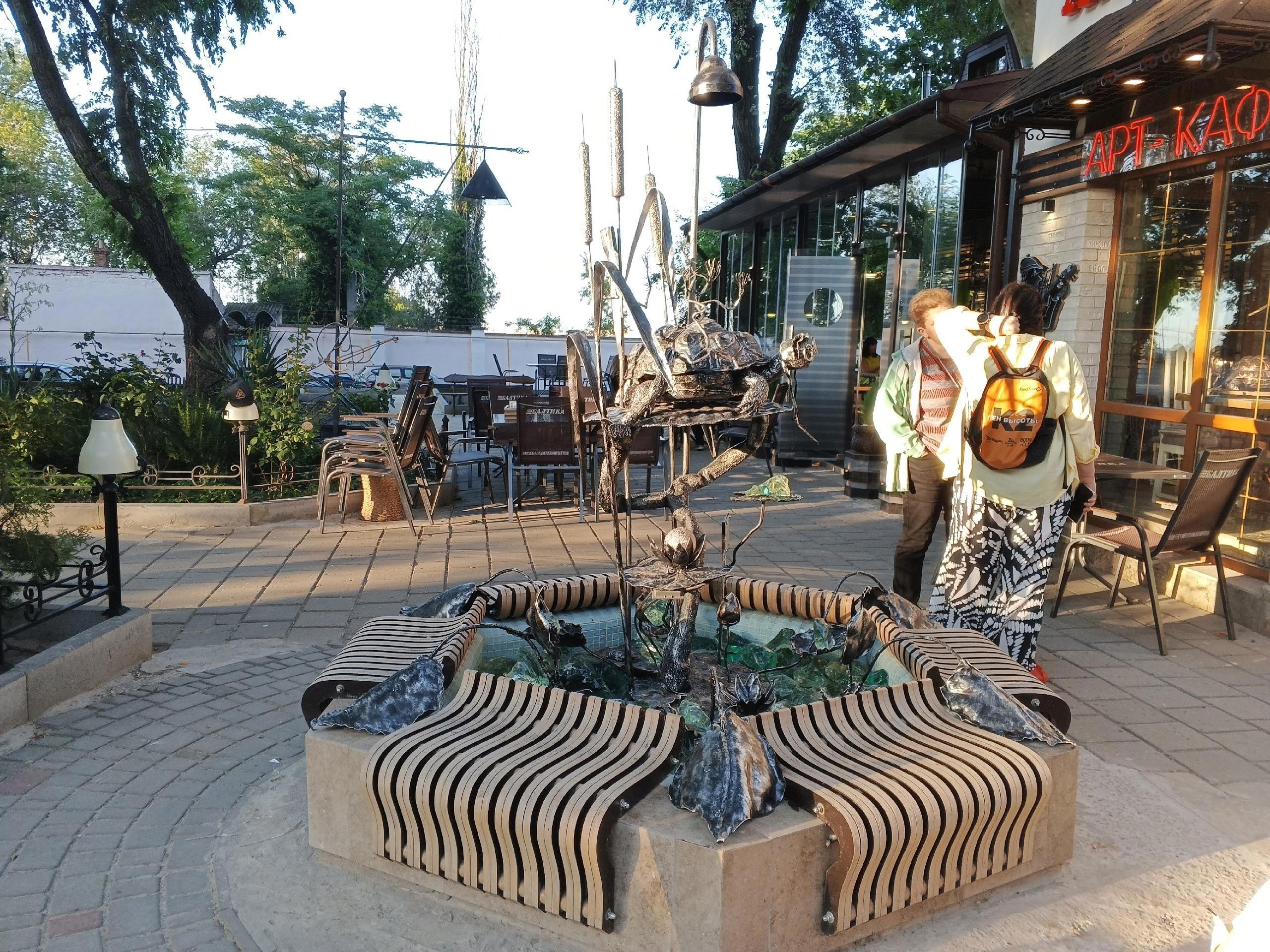 Хозяйка этого очаровательного места - Ирина Жабкина. Мы знаем её довольно давно, а познакомились мы с ней в Коктебеле. Сперва она работала именно там, и уже в Коктебеле в её кафе всех привлекали задорные и смешные лягушата. А теперь здесь, в Феодосии, в арт-кафе вы сможете увидеть совершенно невообразимые вещи. Их своими руками делает муж Ирины.