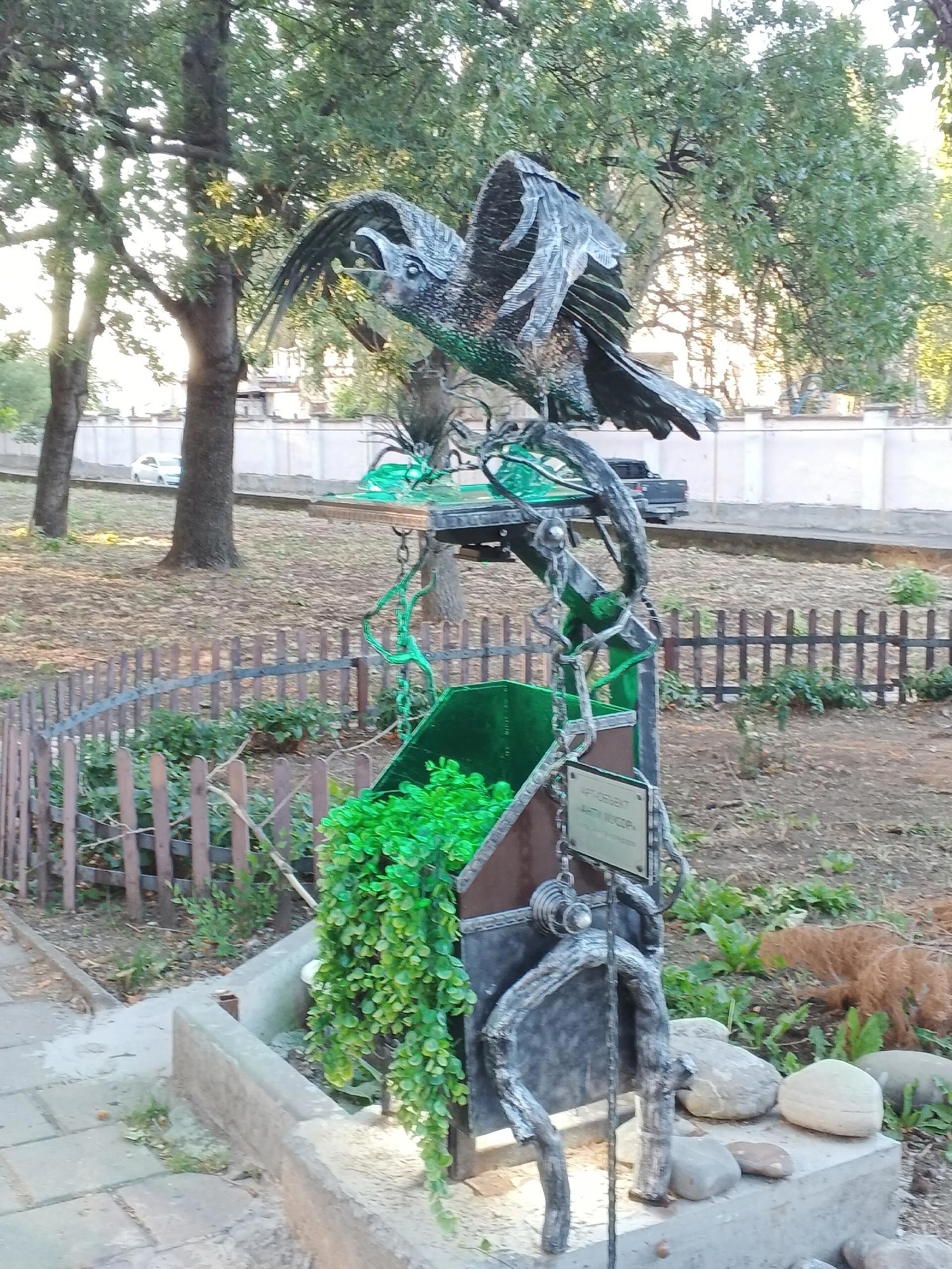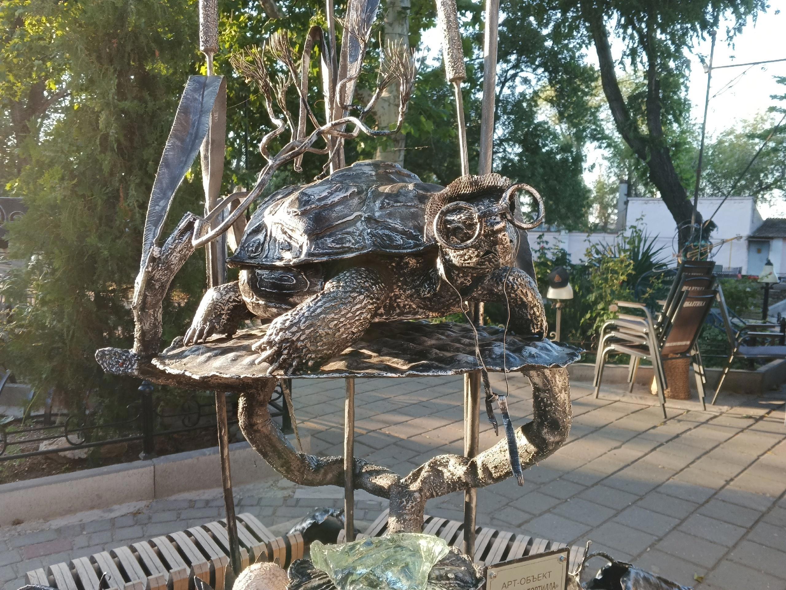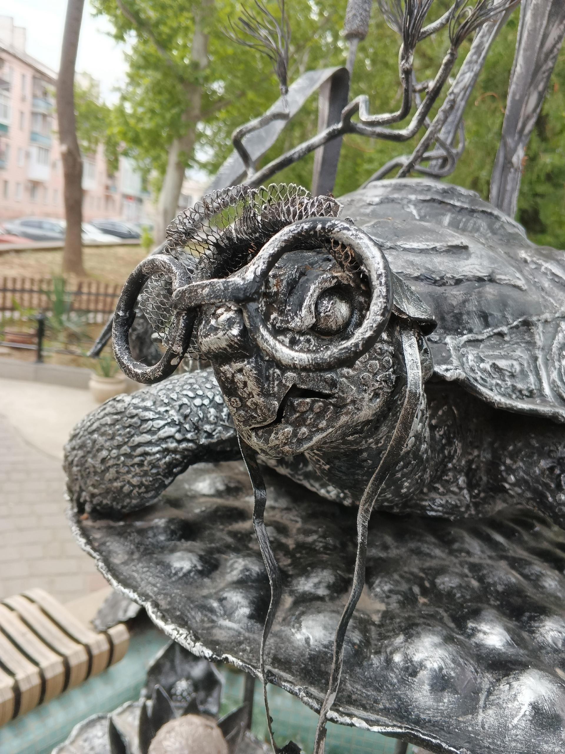 И здесь, в кованном болоте, на кованых листьях и среди кованых кувшинок и лягушек, вас встречает... Черепаха Тортилла.