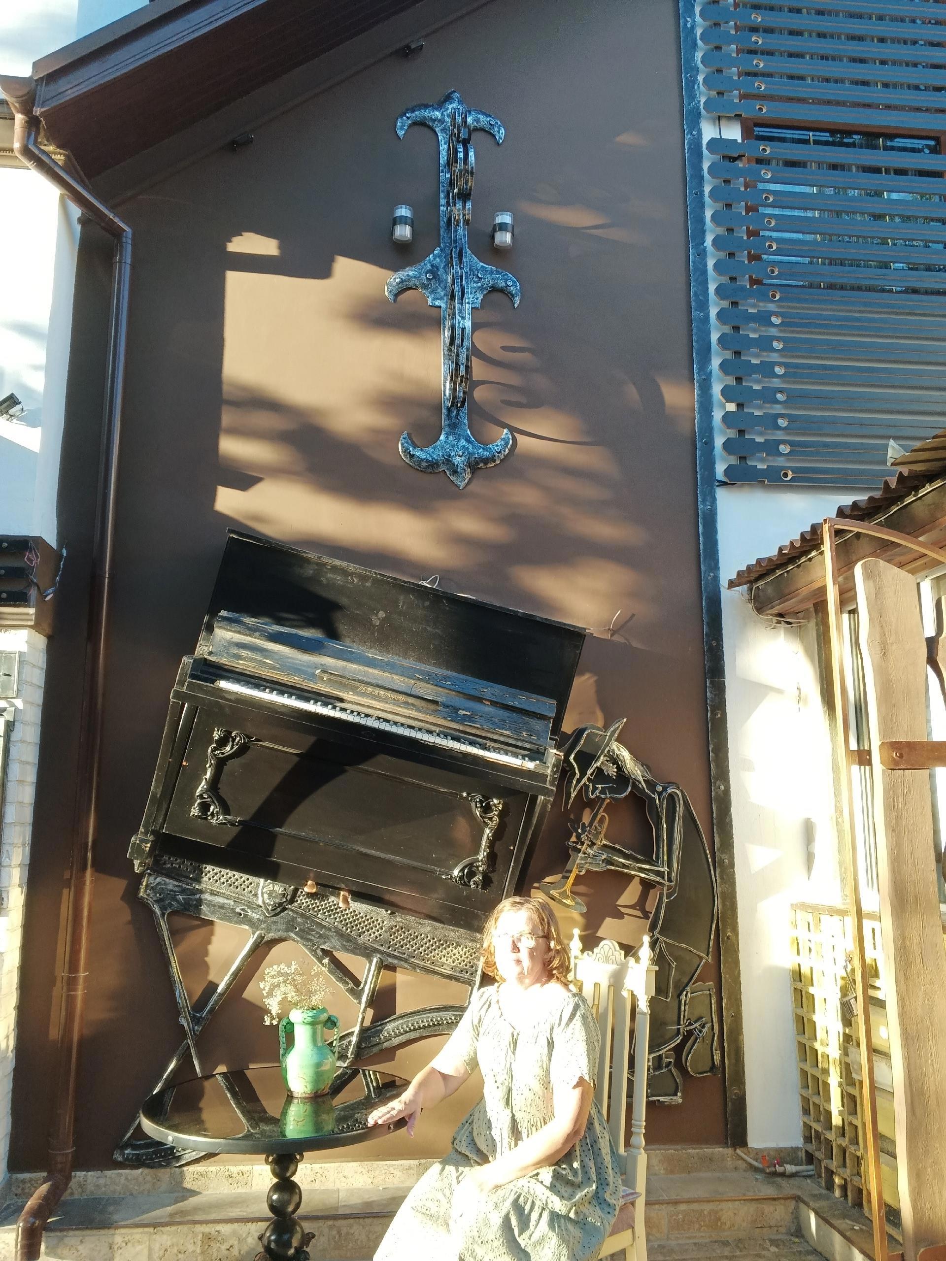 И, выясняется, что трубач не просто стоит здесь. Из стены выглядывает настоящее пианино. Более того, на стул возле пианино может присесть любой, а если посетитель отважный, то может рискнуть и поддержать трубача в его творчестве. Правда, пианино взлетело высоко на стену, надо ещё суметь дотянуться и открыть его.