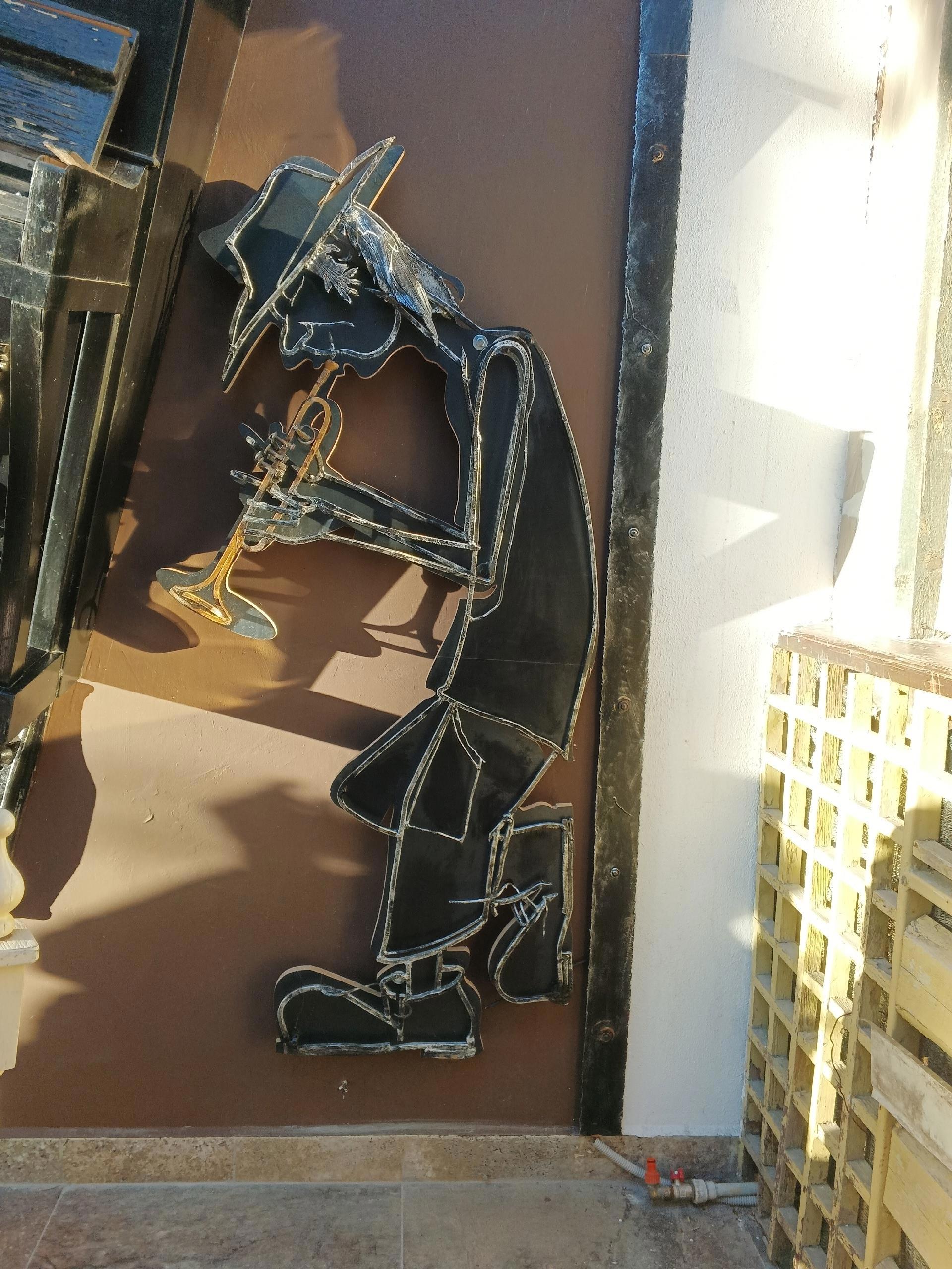 А возле входа, на стене из которой вырастает изящное украшение из металла, стоит ещё один трубач.