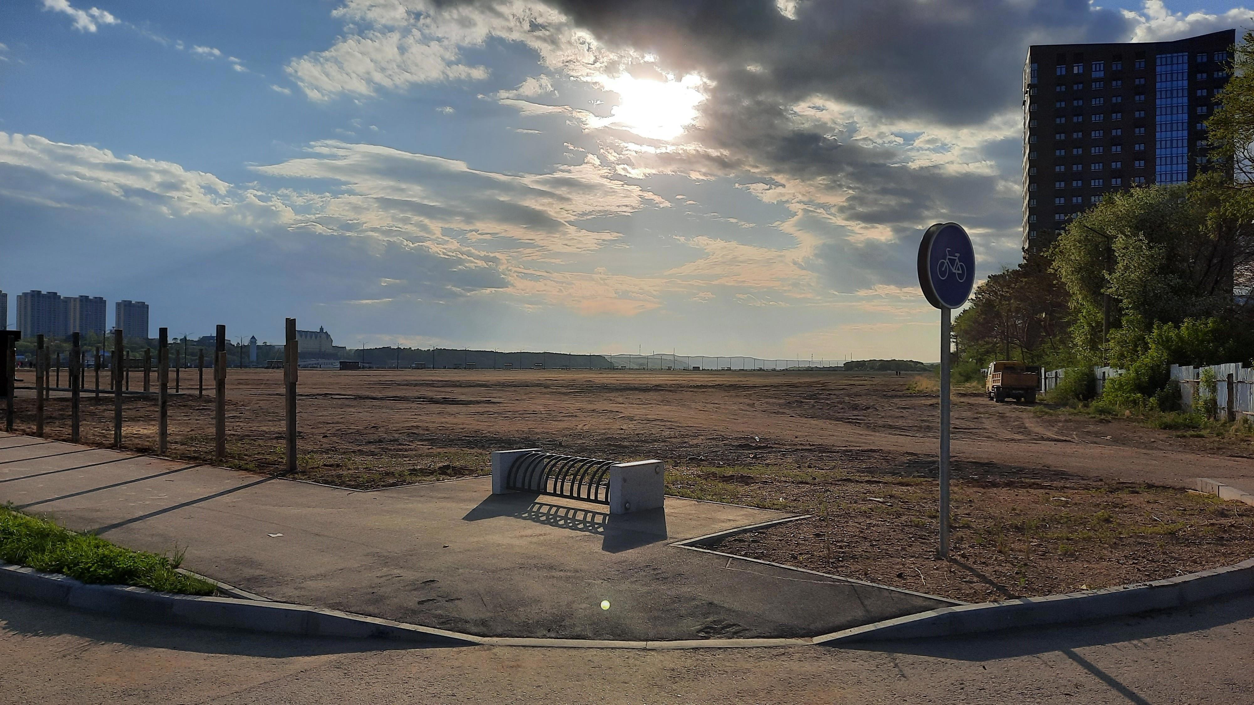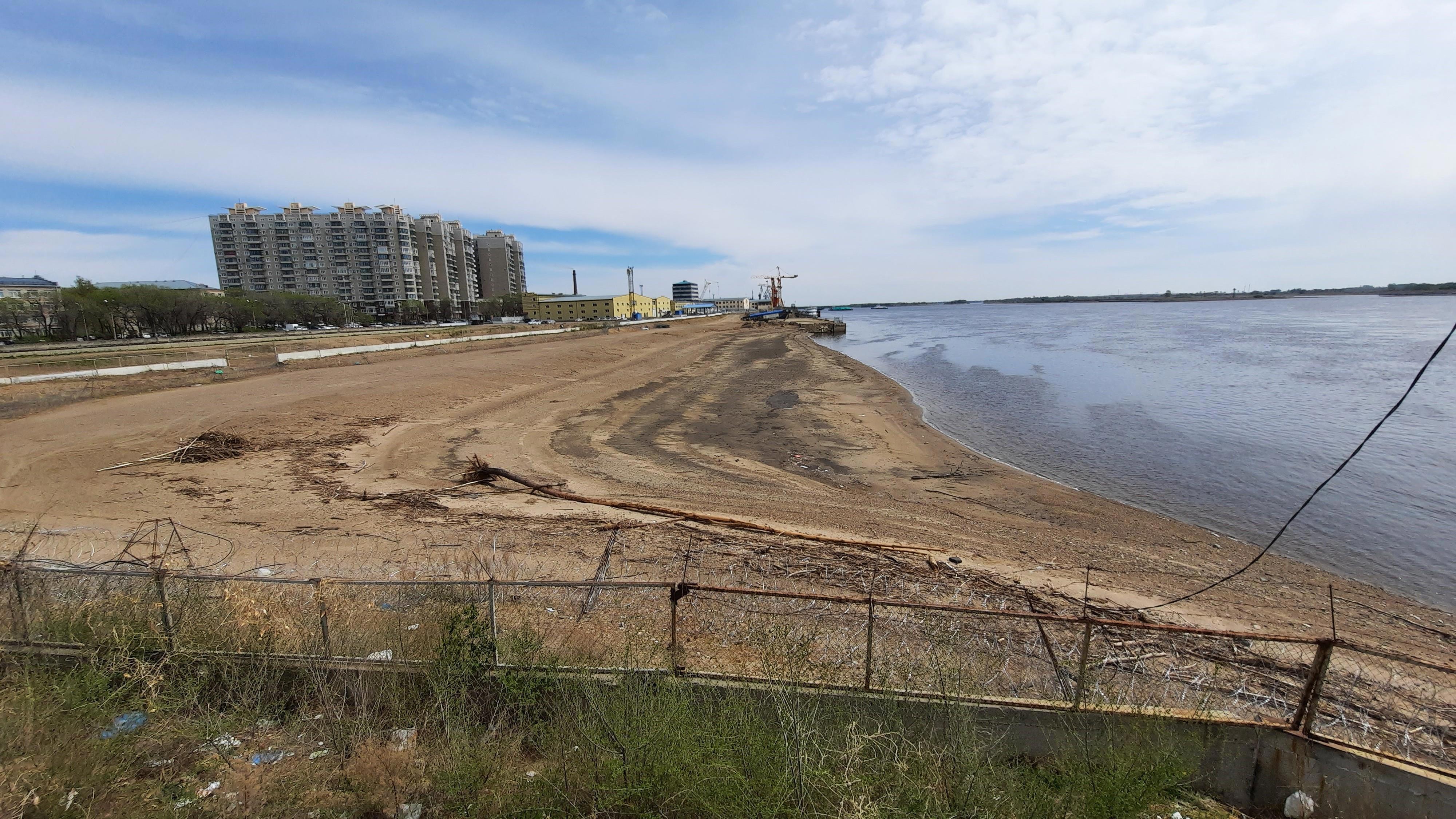 На этом фото видна старая набережная и, соответственно понятна территория отвоёванного у реки участка - слева новый забор, а за ним, практически у деревьев, можно рассмотреть серо-желтую бетонную набережную советского периода.