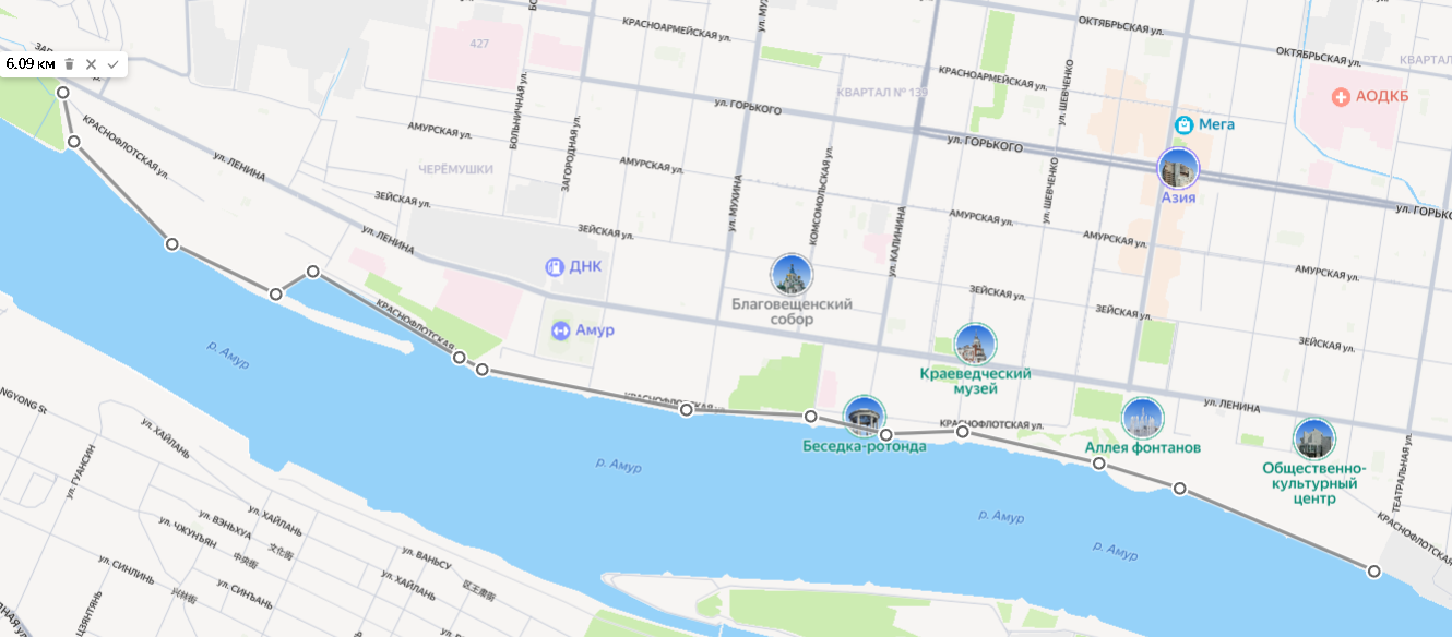 Вот так на "Яндекс картах" выглядит набережная реки Амур в Благовещенске.