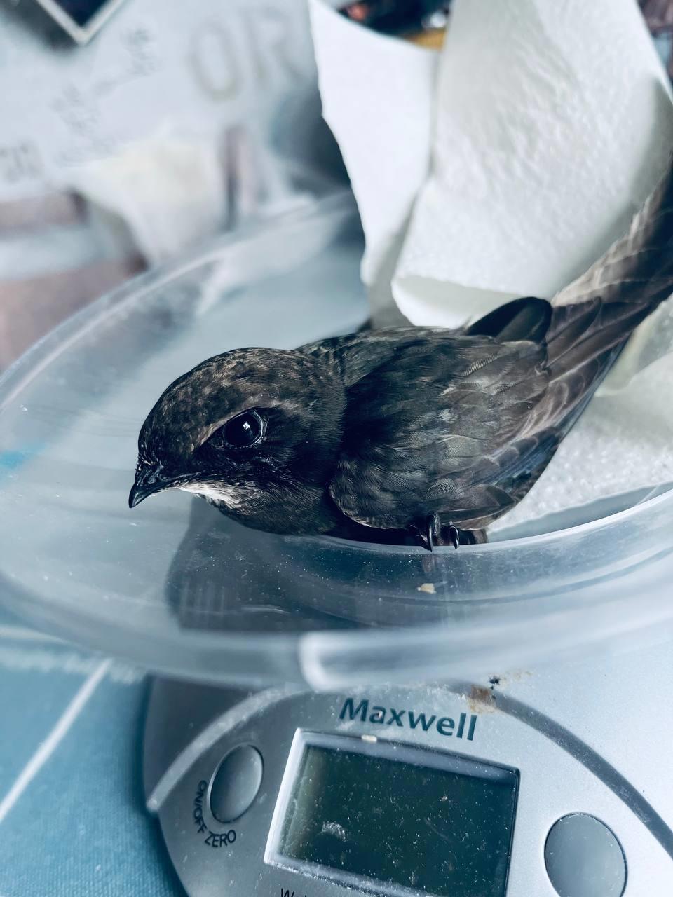 Первым ко мне попал Шаурма. Его подрали вороны, исклевали спину, глаз, крыло, выдрали опные перья. Это взрослый стриж. Его нужно кормить 3-4 раза в день, нормой в 12 гр корма за сутки. Каждое утро натощак взвешивание, контроль веса, корректировка рациона. В норме весь у взрослого 38 гр. и выше. Если опускается ниже 37, это уже алярм и увеличение дозы. Стрижи очень компактные, тихие, не вонючие. С этим никаких проблем. Они спокойно прибывают на реабилитации в домах с детьми, кошками, собаками.