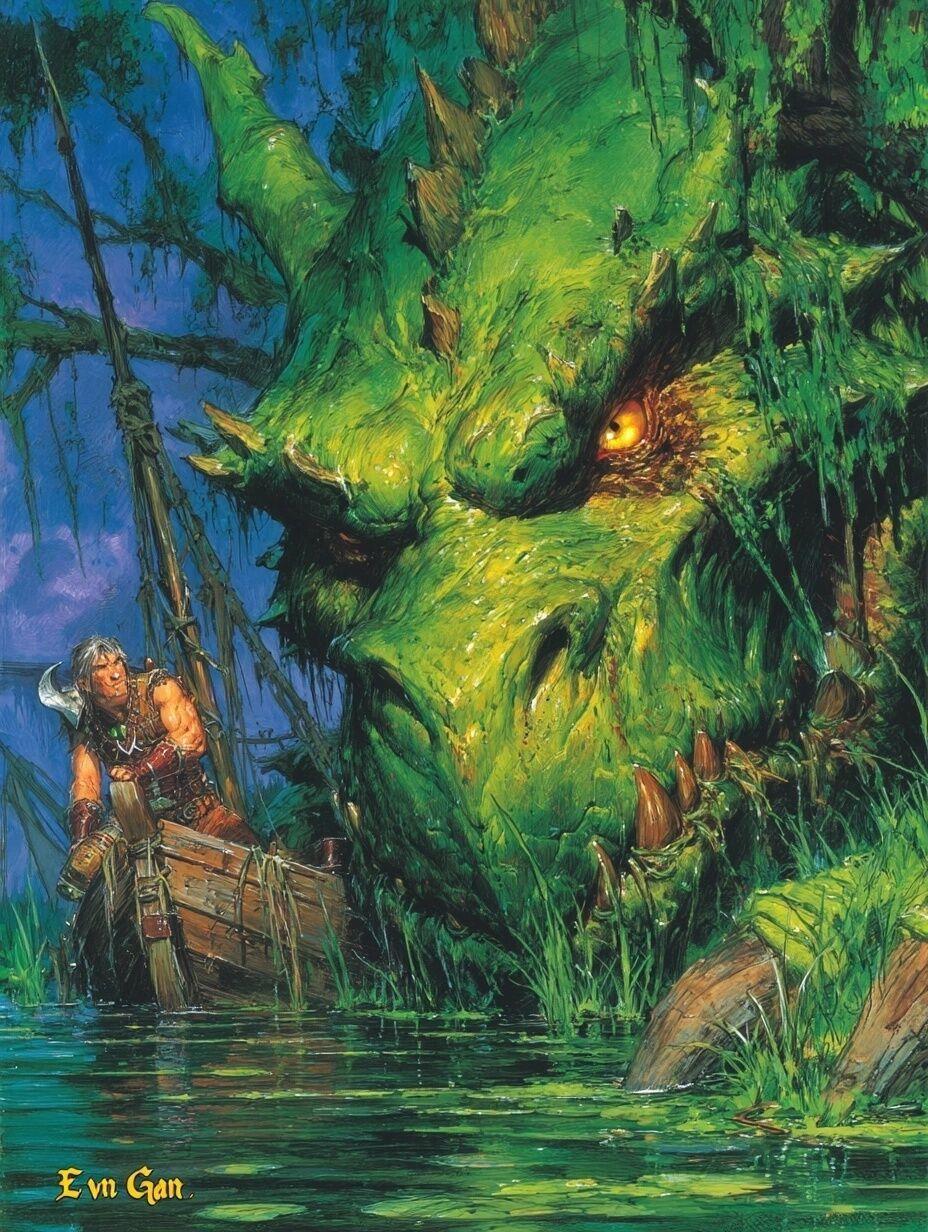 «Наконец-то на мою топь заглянул гость! Жаль, что худоватый, но и такой на закуску сойдёт!» — тешился дракон, таясь наполовину в воде, будто зелёный холм, заросший водорослями.