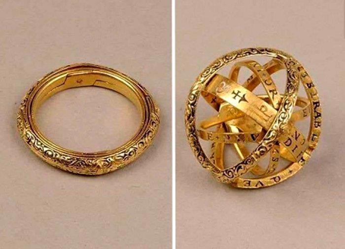 Первая штука — это кольцо, раскладывающееся в миниатюрную армиллярную сферу — астрономический инструмент для определения положения небесных тел. Такие украшения стали популярными в XVI–XVII вв., отражая увлечение эпохи Возрождения наукой, в частности, астрономией, и оставались таковыми вплоть до XIX века. В Британском музее есть коллекция из нескольких таких колец.