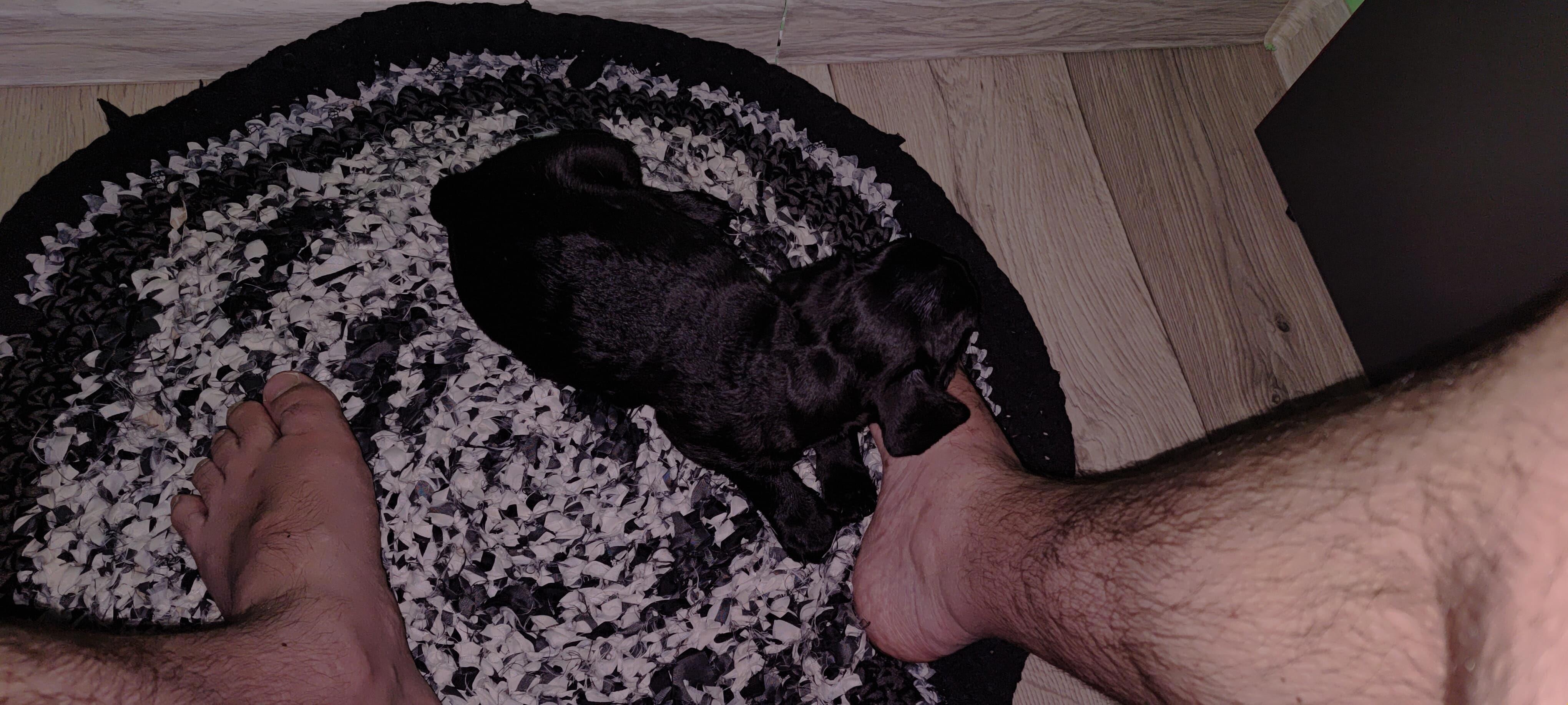 Сам Лёха, утомлённый боями с шерстяной угрозой, притаился на земле, и немного в ауте, но рукотворный коврик - его новый союзник. Собакен вымыт новым шампунем и пытается приватизировать лоток кошки, (так как гулять ему до прививок пока нельзя, изучаем тряпочку).