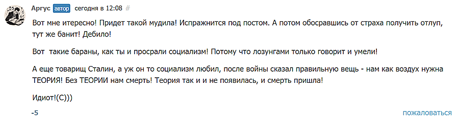 Проходит час и автор САМ добавляет другого комментатора в ЧС, что бы ему не могли ответить, а после этого еще и начинает писать ответы заблокированному пользователю, причем напирая на то, что "раз не отвечает - то значит слился!"