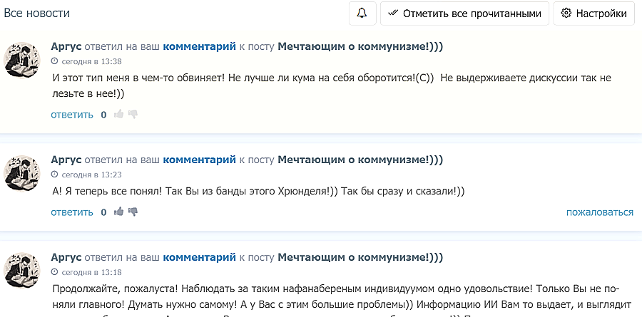 Но вот - убедился! Сначала он оскорблял, вместо ответов по существу (тк не нравилось, что ему не поддаются на тролиннг с переводом темы, указывают на то, что это прием демагогии и таки просят ответить на заданны вопрос по существу), затем забанил и после этого стал радостно честь свое ЧСВ тем, что ему не отвечают!