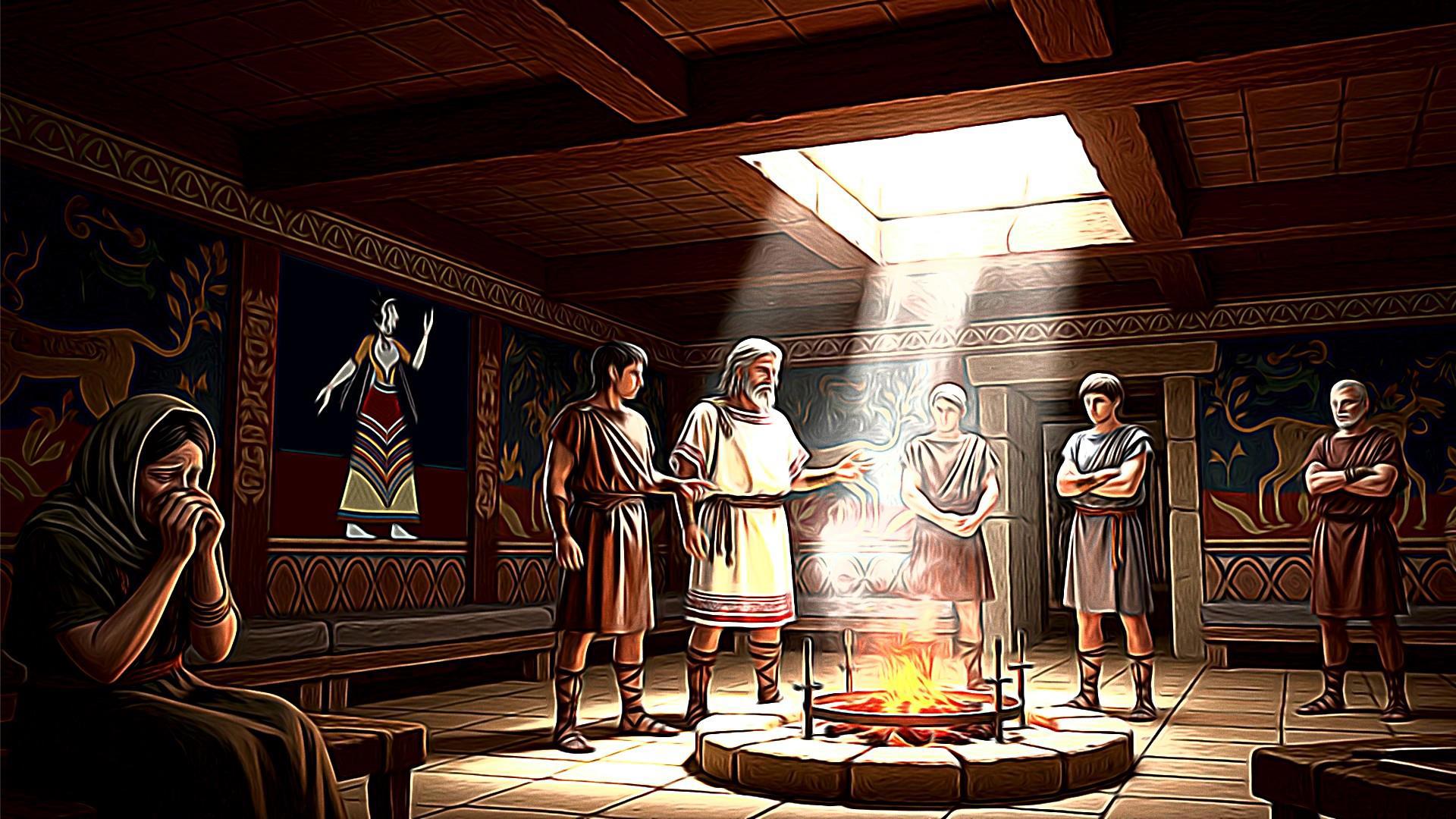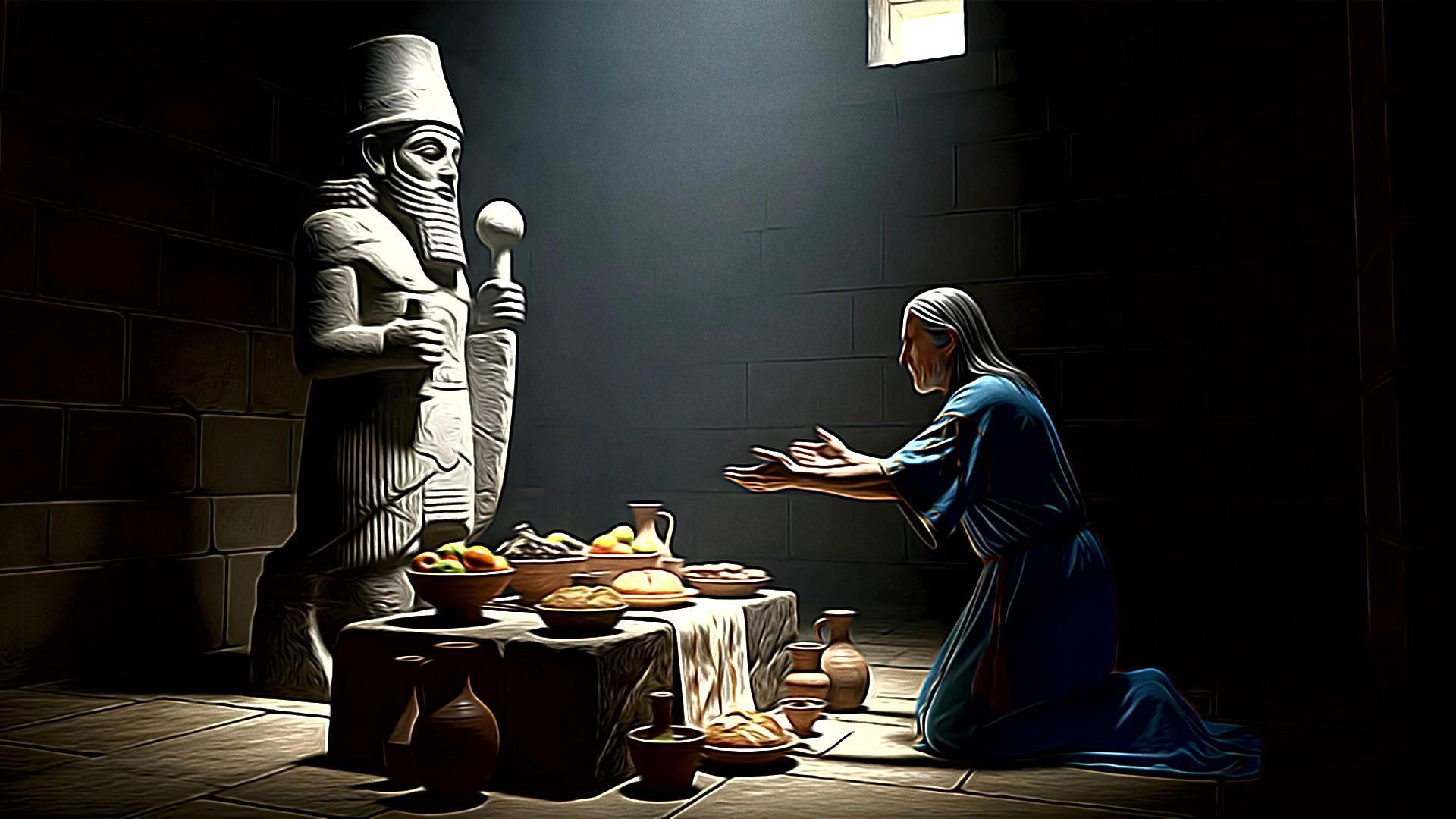 Хастияр молит Бога Грозы о здоровье дочери Карди и благополучных родах. Карди рожает очень тяжело и несчастный Хастияр ни о чём не может думать. В таком состоянии он и проворонил интригу Пудухепы с престолонаследием. Бог Грозы здесь с булавой хенапи, которой он и создаёт гром и молнии. Облик немного ассирийский получился, ну да ладно. Кстати, само алтарное помещение хеттского храма удалось сделать исторично - там действительно было маленькое окошко, устроенное так, чтобы свет падал на статую.