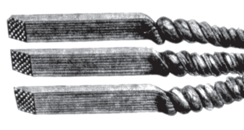 Использовался также кручёный харалуг; бруски из разнородных сталей сваривались, перекручивались спиралью, проковывались соединяясь, образуя "узорчатую" структуру. Большое количество европейских мечей старше 10 века, дошедшие до наших дней, имеют именно харалужную структуру. При этом следует знать, что при изготовлении клинков методом ковки очень сильно расходуется метал. Часто в готовом клинке его оставалось только 15%, от взятого в заготовке.