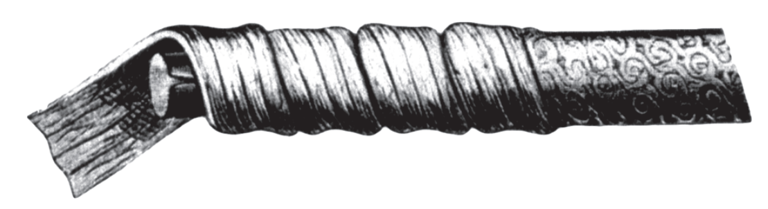 Закрепляются детали рукояти из дерева на металлической основе на заклепках и это трудоемкая и ответственная операция, так как древесина хрупкая (а данном случае нужно использовать вяз, граб или бук) и ударами молотка ее можно легко расколоть.