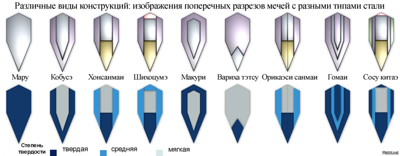 Схемы различных типов сварных японских клинков.