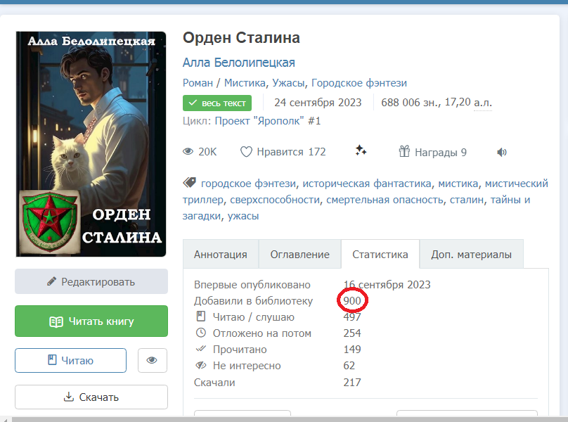 Автор: Алла БелолипецкаяДорогие друзья, вот такая красивая цифра образовалась у первого из романов цикла о моем любимом герое Николае Скрябине - следователе-интеллектуале с паранормальными способностями