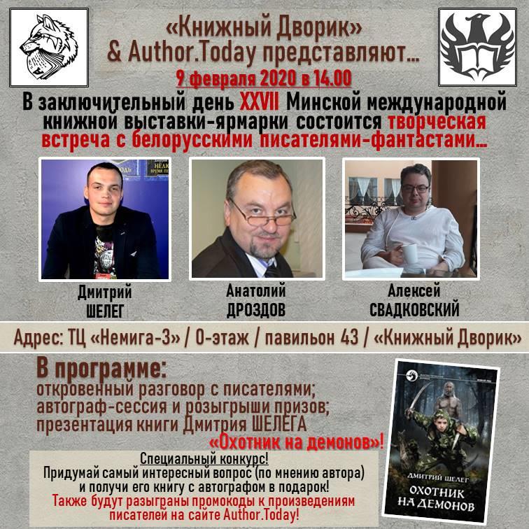 Автор: Алексей СвадковскийДобрый день, друзья и читатели! В заключительный день Минской книжной ярмарки, мы с коллегами по перу Дмитрием Шелегом, Анатолием Дроздовым и я Ваш скромный слуга, решили провести небольшую творческую встречу с читателями- Поговорить о книгах, о планах на будущее и обо всем, что Вам будет интересно. Для всех, кто найдет время и возможность посетить нас, я подготовил небольшие подарки и сувениры с символикой Хаоса. Приходите, будет интересно!