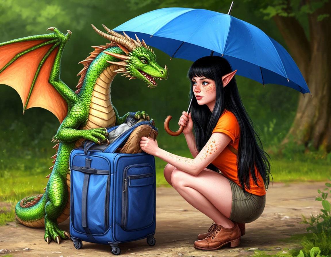 Автор: Алена СказочницаСказочница пыталась впихнуть в дорожный саквояж башмаки и зонт, но саквояж выплевывал это обратно. К ней подбежал дракон и радостно захлопал крыльями: