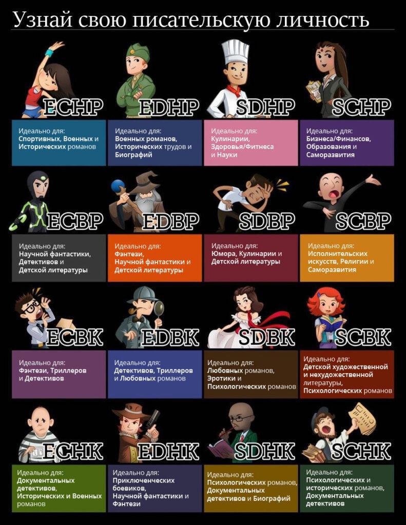 Теперь тебе нужно найти в таблице ниже твою индивидуальную комбинацию писательских черт, чтобы увидеть результат. Помни, что это отчасти шуточный тест, и он не означает, что ты не можешь работать в других стилях.