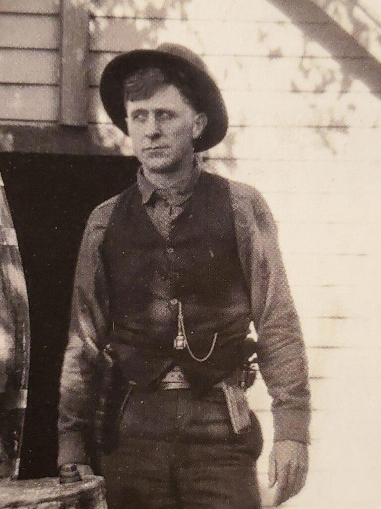 Справа на поясе пистолет Colt 1911 в положении "курок взведен и на предохранителе". Слева револьвер Colt Single Action Army, в петлях кобуры патроны для SAA.