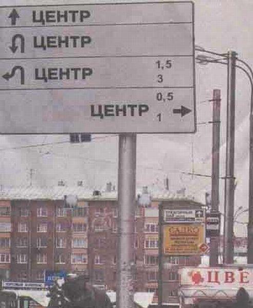 От рекламы переходим к другим общедоступным источникам информации — вывескам и объявлениям. Тоже, знаете ли, вечный источник вдохновения... Да-да, именно вечный — например, с тех пор, когда все дороги вели в Рим, почти ничего не изменилось, и сегодня все дороги ведут... правильно, в центр: