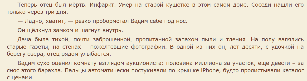 Скрин отрывка из книги не прилагаю, так как она аудио. Но моментов, где я волновалась, или умилялась, или хохотала в ней полным полно. Рекомендую.