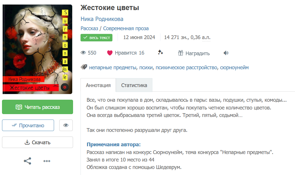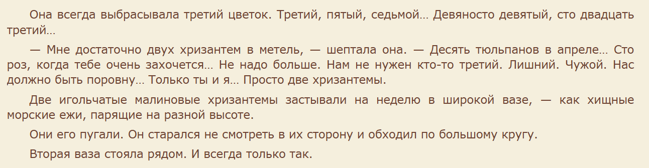 Он любит цветы и немного суеверен, а она обожает симметрию. Он любит ей дарить цветы, а она каждый раз находит нечётный цветок, рушащий симметрию, и убивает его. Простая житейская история с необыкновенным драматизмом, с любовью-ненавистью, с психологическим сломом, с местью. И очень-очень красиво написанная. Знаете, язык палитрой напоминает Куприна или Бунина, а, может быть, и Франсуазу Саган. Не знаю. Но давно ничего не читала ничего, настолько тонко, атмосферно и легко написанного.