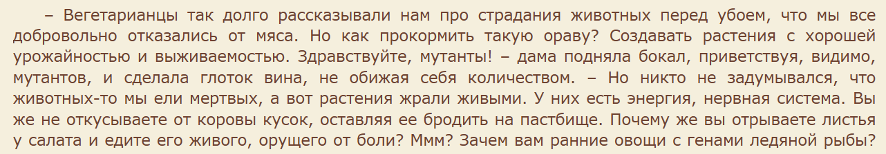 Мир победившего вегетарианства и генномодифицированных продуктов. Жуть и треш, но шикарно написанная.