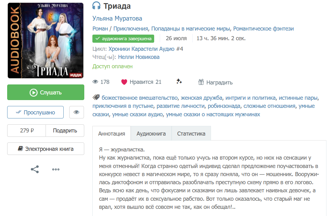 И аудиокнига. Для меня показатель хорошего чтеца, это когда чтец не мешает слушателю. Эта аудиокнига мне очень зашла. Особенно сейчас, когда тотальный нечитун.