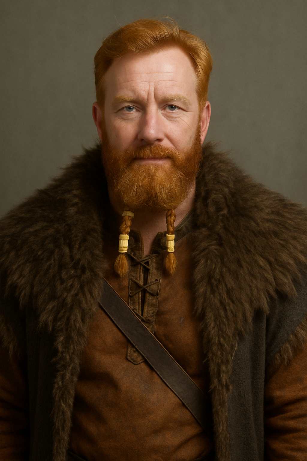 Рядом с ним, прислонившись спиной к стене, развалился коренастый горец примерно его возраста, облачённый в меха и кожу. Первым, что бросалось в глаза, была его длинная рыжая борода, заплетённая в пару толстых кос, перевитых кожаными шнурками, на которых болтались клыки и деревянные бусины.