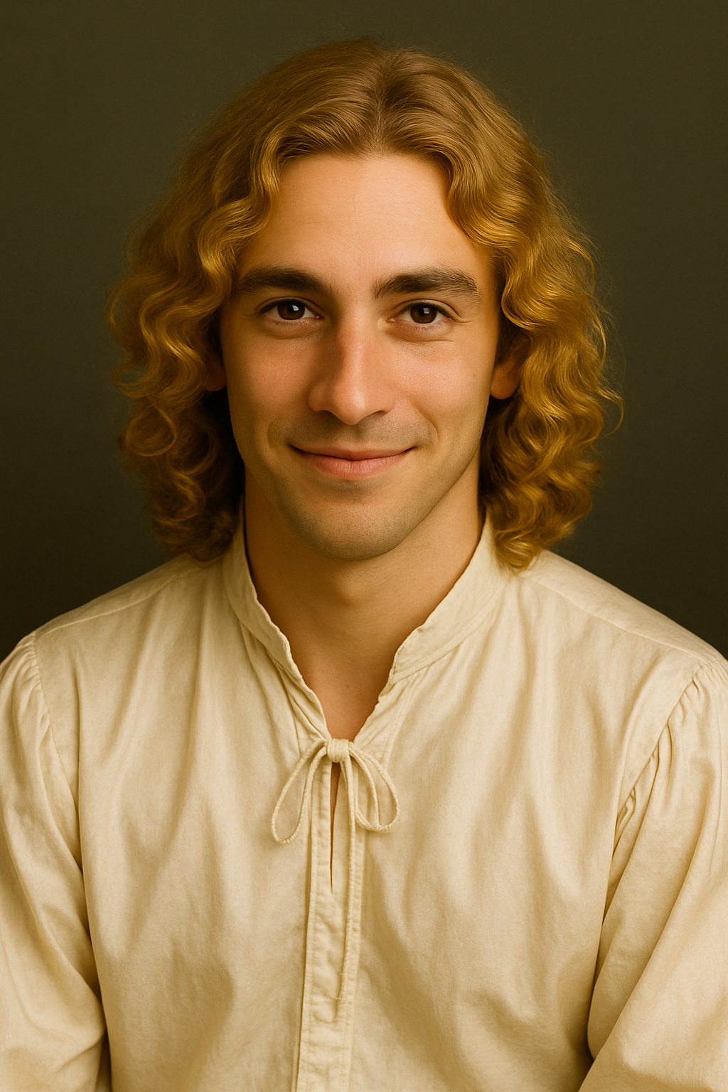 ...его собеседник — молодой человек в шёлковой рубахе с объемными рукавами, какие носят городские щёголи, то и дело хохотал, хлопая ладонью по столу и грозя горцу пальцем. Его тёмные смеющиеся глаза резко контрастировали с длинными соломенными кудрями, которыми юноша то и дело встряхивал, откидывая их назад.