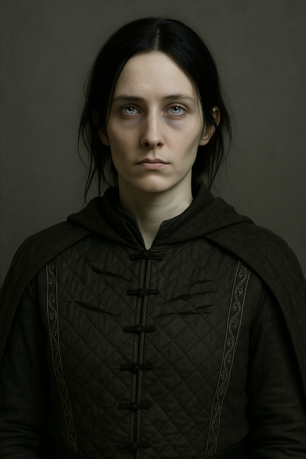Это была женщина — в поношенном стёганом дублете, выцветшем до серого цвета и аккуратно заштопанном на груди. Серебряная вышивка там разошлась с равными промежутками, которые вызывали неприятные ассоциации с ударом гигантской когтистой лапы. Длинная рапира с ажурным щитком и изящно выгнутыми кольцами выглядывала из-под полы тяжёлого вощёного плаща с потрескавшимися заломами на плечах. Лицо женщины было усталым и болезненно-бледным, под глазами темнели круги, щёки ввалились, как будто она толком не ела и не спала уже несколько недель. Из-за измождённого вида сложно было сказать, сколько ей лет, но судя по тому, что сухая кожа была гладкой — не больше двадцати пяти — тридцати.