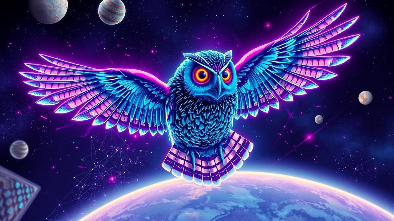 Дополнительно, прикреплю арт от мобильной нейросети с совушкой, преодолевающей и освещающей своими крыльями безмолвное и вечно ночное космическое пространство!
