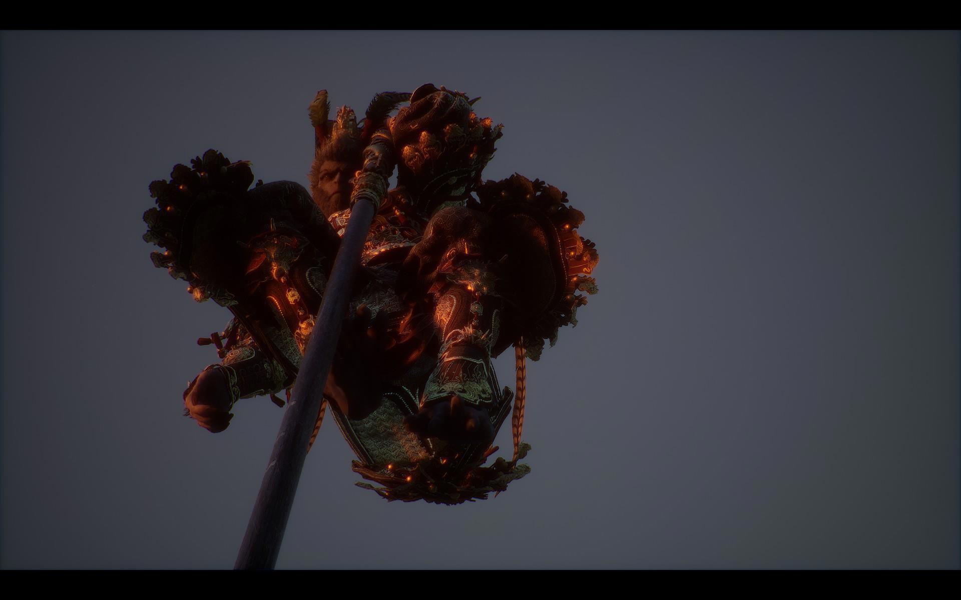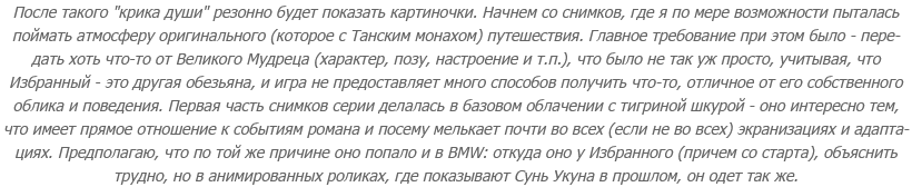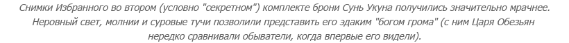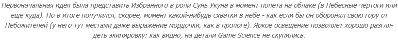 Со стойками и очками концентрации связана и особая роль Цзиньгубана - и, до кучи, брони Сунь Укуна, которую можно собрать в финальной главе, поскольку вместе они дают возможность "почувствовать себя Сунь Укуном". Подробности опущу, но оно того стоит - в том числе с точки зрения финальной битвы. Хотя я его там не использовала. Я вообще в итоге пришла к тому, что надевала на Избранного вещи Сунь Укуна только ради "укуньих скриншотов": из-за драмы в сюжете носить их в других ситуациях мне казалось неправильным.