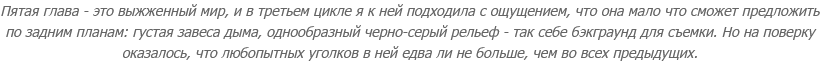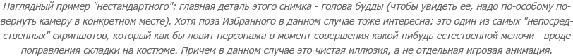 Сделала я скрин, сделала другой, пощупала оверлей в стиме и встроенный в игру фоторежим (скромный, но достаточный для компенсации недостатков оверлея) - и обнаружила, что такого рода "способ прохождения" - когда идешь и ищешь точки для съемки, - существенно освежает впечатления. Я уже не думала о том, что в третий раз играю в одно и то же и вижу одно и то же - каждый уголок стал представляться будто по-другому.