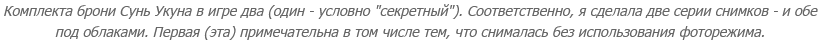 Люди в теме (уже игравшие в игру) могли заметить, что снимки в этом посте показывают все комплекты брони, кроме одного. Это не потому что с тем комплектом что-то не так - он по-своему прикольный. Просто я отложила его на самый конец - в надежде, что пощелкаю с Шляпой духа земли, - но, приступив к съемке, обнаружила, что баг фоторежима, который размывает движущиеся объекты, затрагивает и Шляпу. И т.к. "светить" интерфейс, снимая без фоторежима, мне не хотелось, комплект остался вовсе неохваченным.