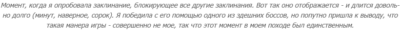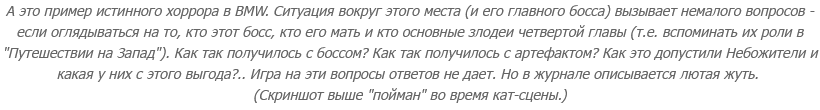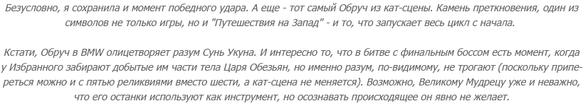 Ладно, можно сказать, что и в "Путешествии на Запад", и здесь куча допущений, что "соулсы" в принципе часто строятся на неопределенности и что игра вообще бы не состоялась без некоторых изменений в концепции. Но жопа, блин, до сих пор горит. И не из-за нелогичности - логику в сюжете как раз проследить нетрудно, - а из-за того, что я знакома с предысторией персонажа и с ее учетом описанный сценарий превращается в форменную трагедию.