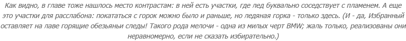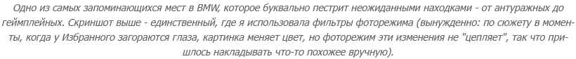 Правда, попутно вылезла и неприглядная изнанка: оказалось, что в BMW просто прорва визуальных и околовизуальных багов. К тому же, я где-то читала, что она "поощряет исследование", но жажду этого исследования со всех сторон "подперли" тем самым "коридорным" дизайном. В итоге я еще и кучу багов зафиксировала, и испытала немало неприятных минут, когда меня не пускали туда, где я легко могла пройти по всем законам физики и здравого смысла.
