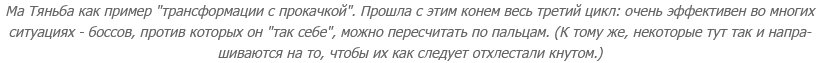 "Стойка столпа" (самая, пожалуй, зрелищная из трех) у меня появилась и того позже. Хотя, будь я "в теме", вкачала бы ее существенно раньше, потому что это зачастую универсальное решение: мало того, что персонаж в этой стойке на некоторое время оказывается вне досягаемости для большинства врагов - он из нее еще и лупит далеко, больно и по площади. А еще она позволяет пить из бутыли - прямо там, "на верхотуре".:) В общем, во 2-ом и 3-ем цикле она была у меня уже самой "ходовой", серьезно потеснив и "ударную", и "стойку выпадов". "Ударную" я тогда вообще применяла очень редко - фактически, в тех ситуациях только, когда требовалась частая смена приемов.
