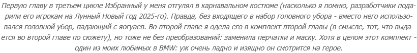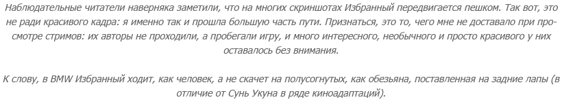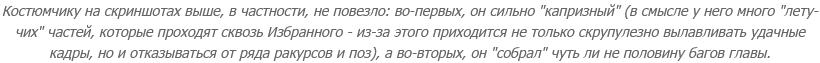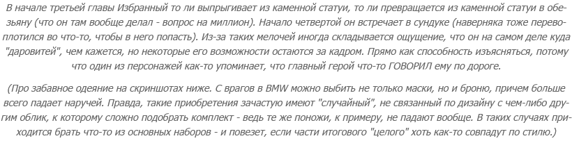 Я даже дырки в костюме Избранного обнаружила - когда делала его скриншоты вблизи, думая показать проработку деталей! Конечно, у меня не было иллюзии, что там досконально вылепленное одеяние на досконально вылепленном теле обезьяны, но открытие было неожиданным - и неприятным. Потому хотя бы, что оно вызвало ощущение, что в BMW не просто мир забагован - что в ней, блин, сам герой на себе баги таскает.