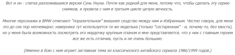 Короче. Я, конечно, помню, что Сунь Укун был не дурак выпить. Он и в загробный мир попал (и попортил там Книгу Мертвых) после знатной попойки, и в Небесных чертогах дебош устроил, потому что его на пир не пригласили (он с этого пира в итоге всех спровадил и, естественно, тоже налакался). В общем, неудивительно, что BMW уделяет этому столько внимания. Но, если все просуммировать, получается, что Избранный - это обезьяна, размахивающая посохом под шафе.