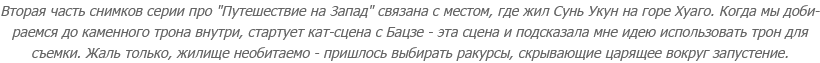 В истории появился... нет, еще не Избранный. Сперва появился некий старый бибизян, который (как потом выяснилось, циклично) отправлял оных Избранных в путешествие - с тем, чтобы они посетили упомянутых выше яогуаев, отобрали у них реликвии Сунь Укуна и вернули их на гору Хуаго. Затем, на горе Хуаго, Избранные, по идее, должны были найти полный комплект доспеха Сунь Укуна и его Цзиньгубан - и вот с этим всем подняться к старому бибизяну на вершину. После чего старый бибизян допускал их к сражению с финальным боссом и, в случае победы... надевал на голову чертов Обруч.