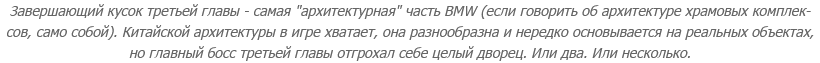 Геймплейно BMW - типичный "соулс": из шести ее глав четыре с половиной представляют собой дорожки "от босса к боссу", а еще примерно полторы содержат элементы открытого мира. В ключевых точках дорожек стоят "Алтари Хранителей" - здешние "костры", где игрок может сохраниться, восполнить характеристики (с традиционным возрождением врагов), выбрать заклинания, телепортироваться в уже посещенные локации и совершить ряд других важных действий. В принципе, на этом все: драться с недоброжелателями и таким макаром продвигаться по истории - это основное, что предлагается делать в игре. Прочие активности либо подчинены этой цели, либо дополняют ее. Исключением, пожалуй, выступают точки медитации - минутки созерцания в бесконечном потоке суеты (истинно азиатское изобретение - и одна из лучших находок BMW).